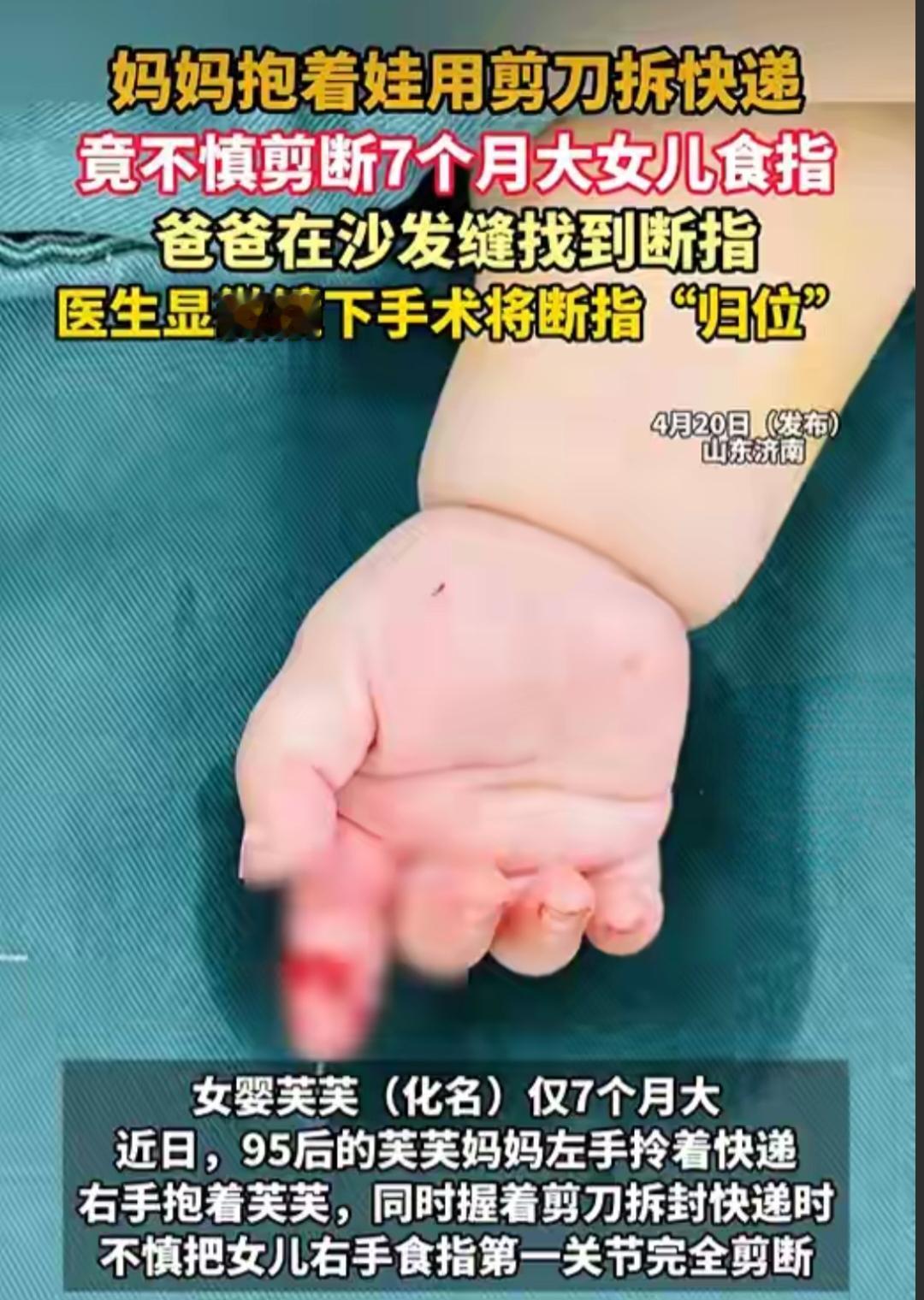 太心疼了!7月大女婴被妈妈剪断食指,爸爸沙发缝里找到断指送医!