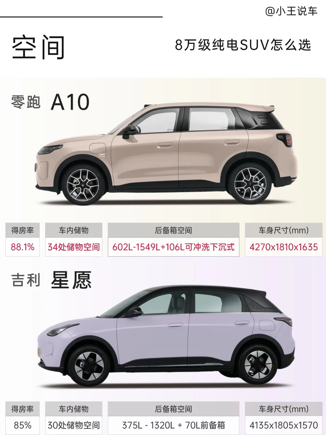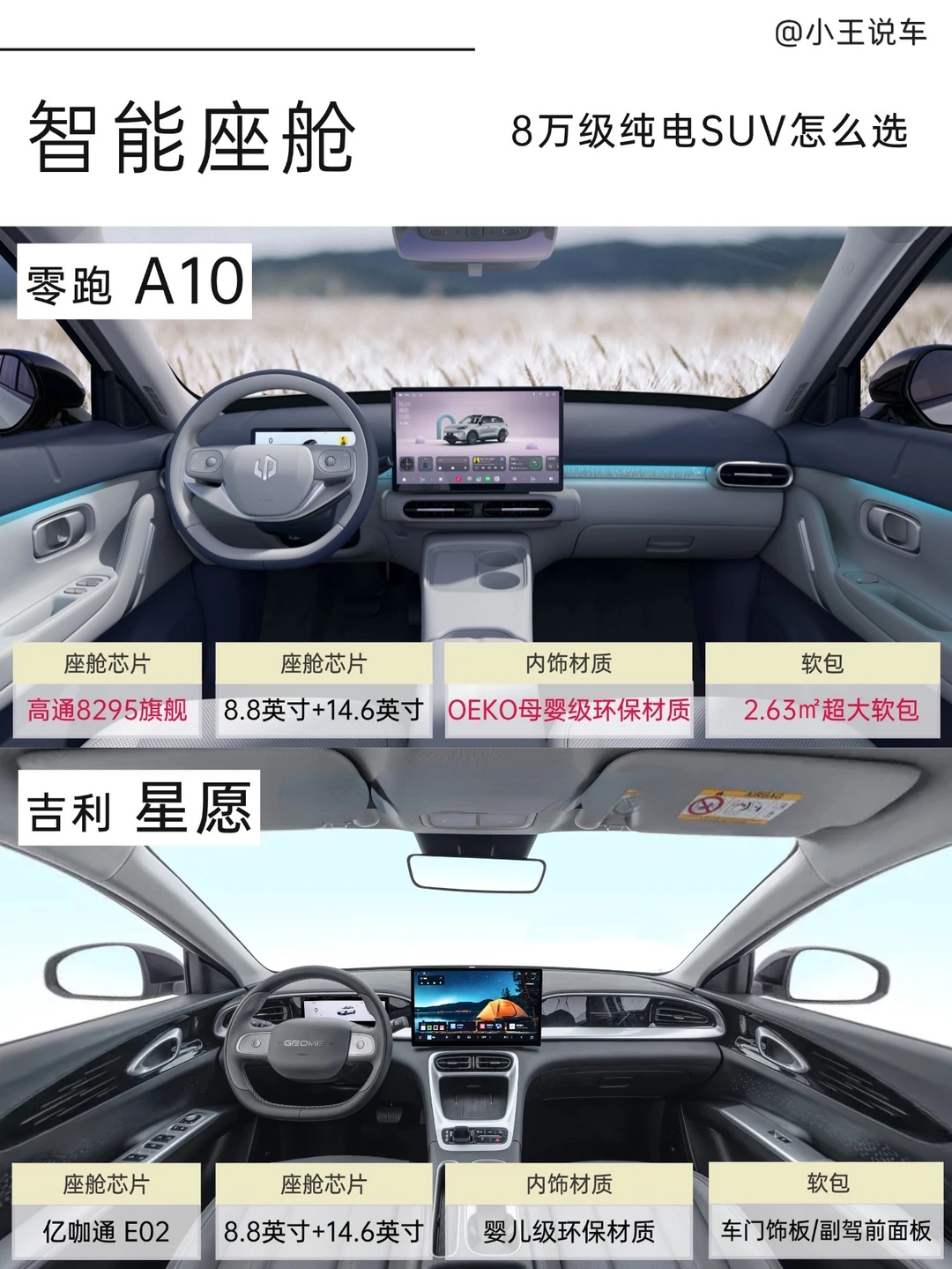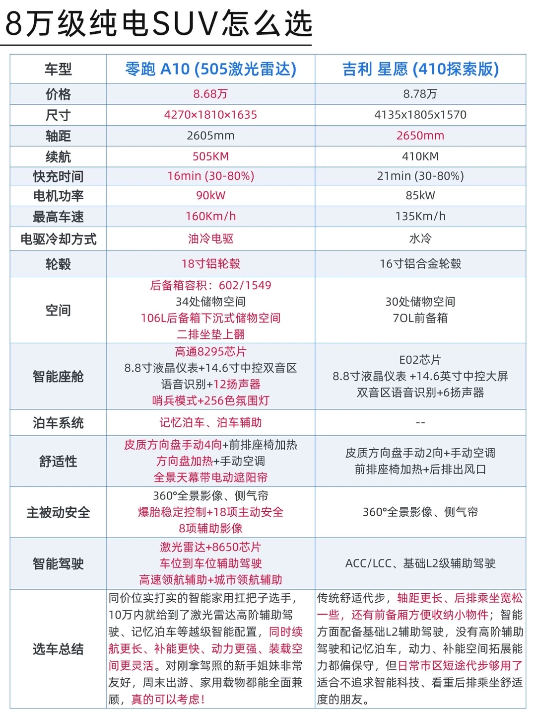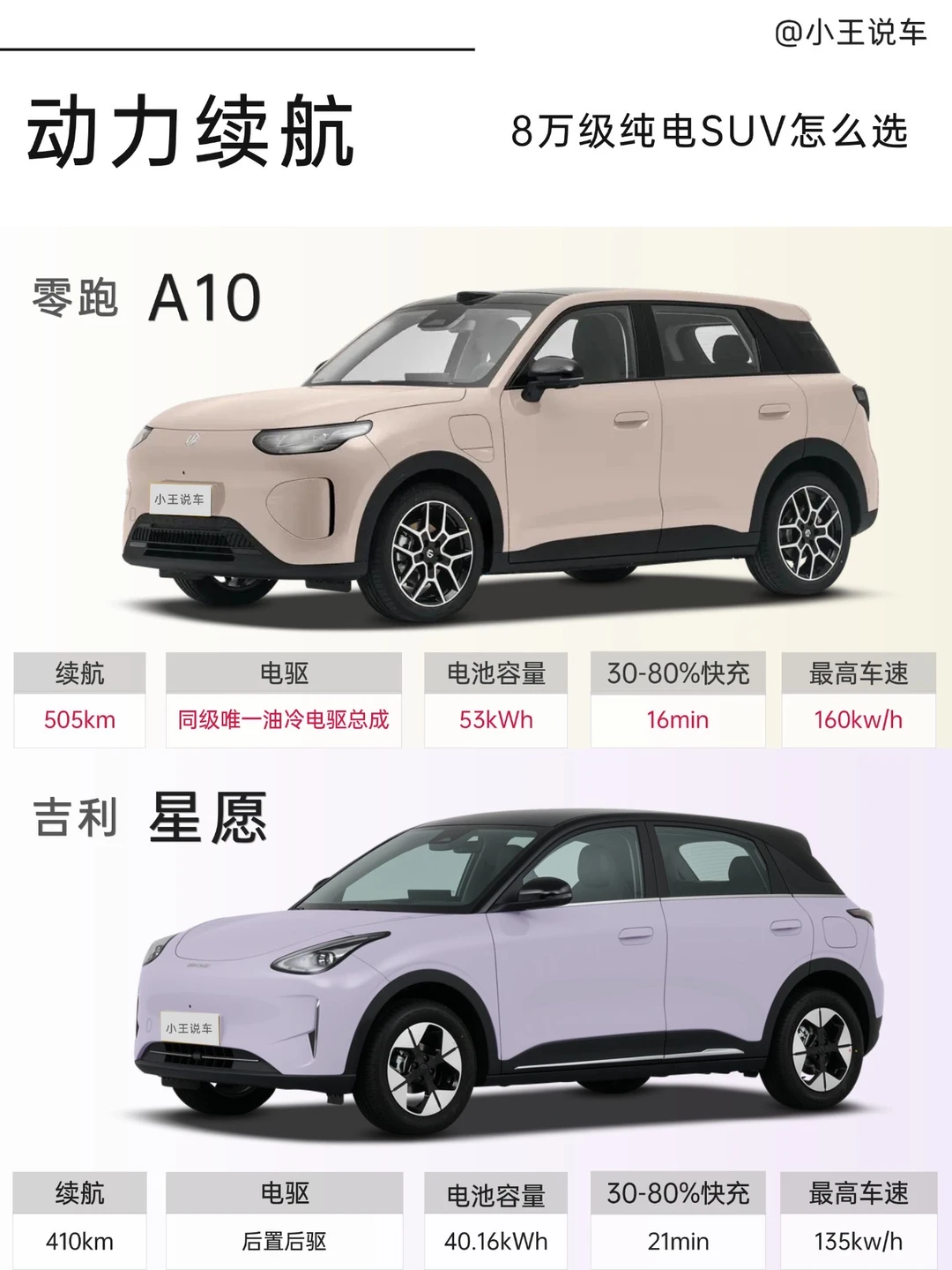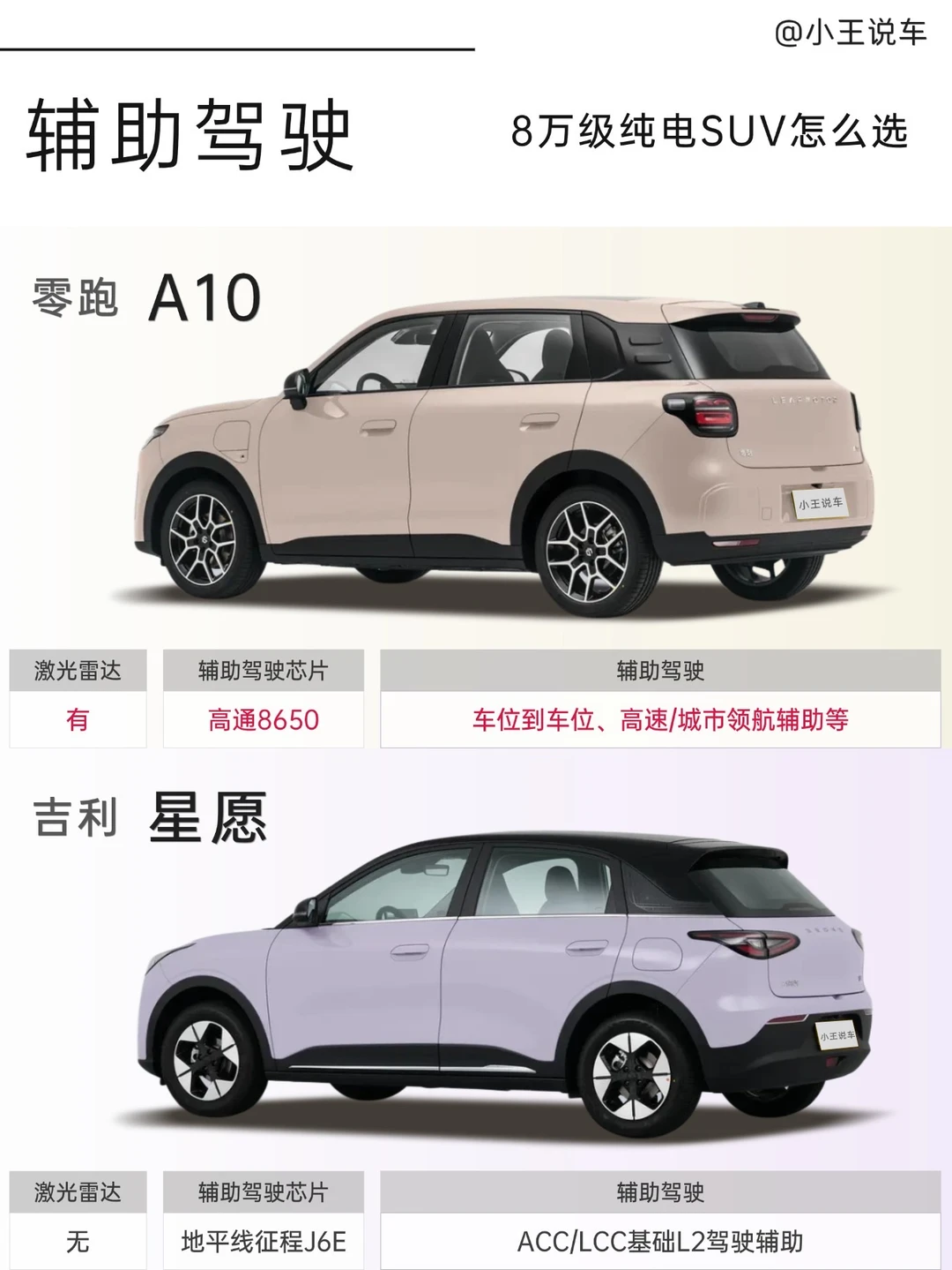 两台车都是好车,⭐️零跑A10外观时尚精致,内饰兼顾科技和健康,空间够大,还有激光雷达,8万级几乎没有其他车型给到这个配置,零跑真的是相当有诚意了,续航也是直接给到505km,配置真的太能打了,新手想要一步到位真的可以考虑一下!⭐️如果你对高阶辅助驾驶没啥要求,日常短途通勤为主,可以选吉利星愿。总之,适合自己的才是最好的~