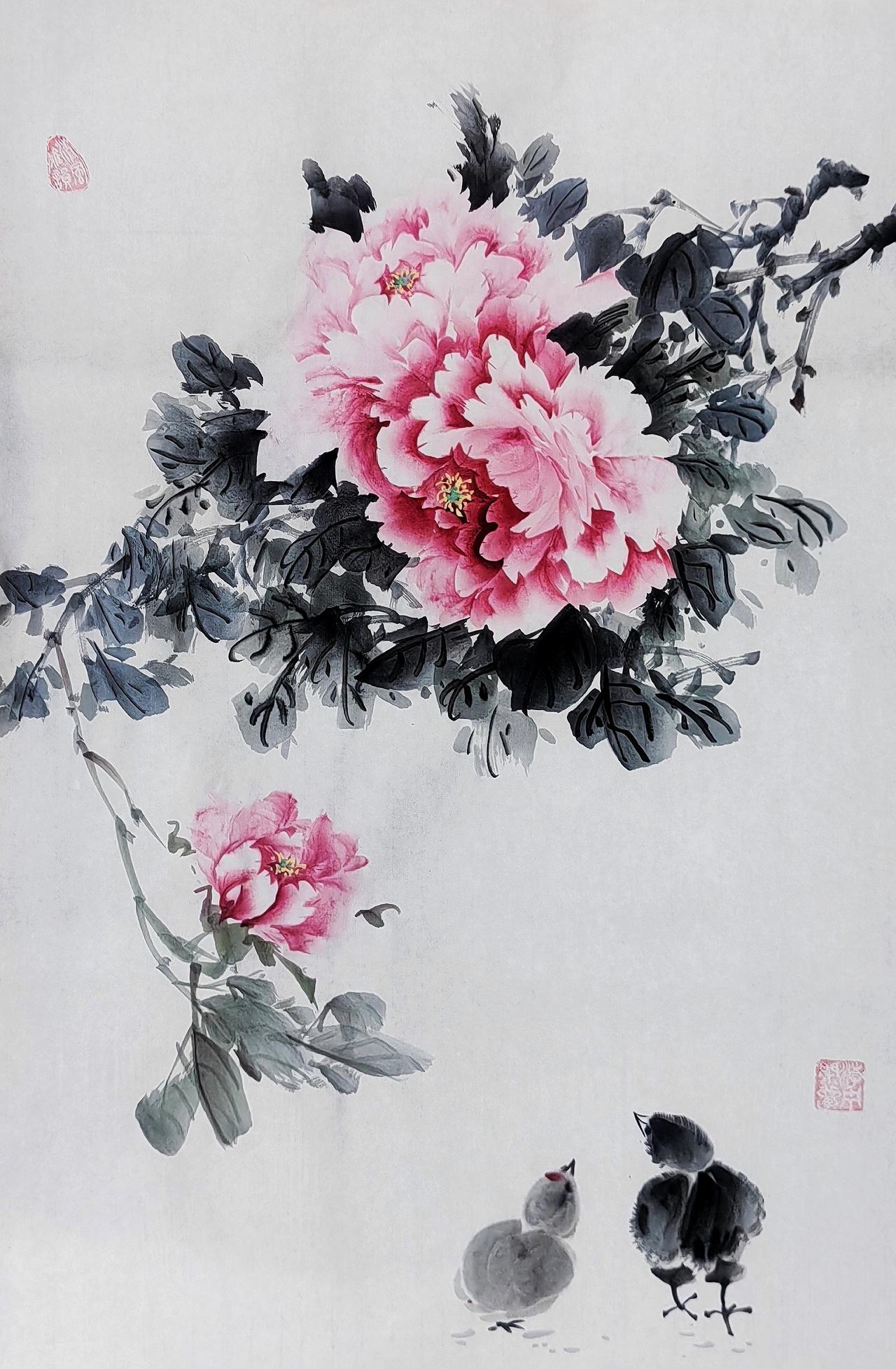 一枝牡丹压群芳,两只小鸡凑热闹。牡丹作品欣赏 国画牡丹花开富贵 国画里的牡丹 原创国画牡丹作品