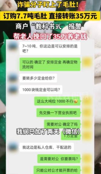 湖北武汉,有个人加了女子为好友,没到两天就向女子订7.7吨毛肚,天降大单,女子很兴奋,马上备货,结果那个人比她还着急,一直催货,让赶紧发车,他还爽快地转了35万元过来,女子发完货后,却越想越心慌,就赶紧报了警,真相浮出水面,女子吓出一身冷汗。