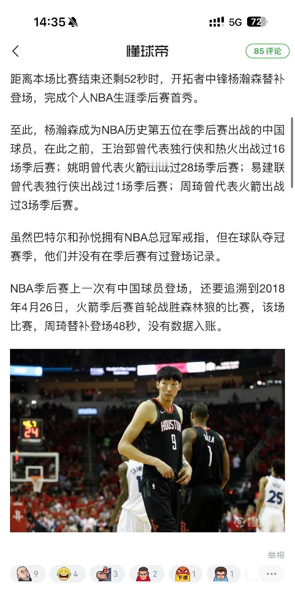 上一位在季后赛登场的中国球员还是2018年的周琦,时隔多年终于又有中国身影站上NBA季后赛赛场。虽然登场时间不长,没有获得出手机会,但这一步意义非凡,见证中国球员的稳步前行,真的太值得骄傲了。