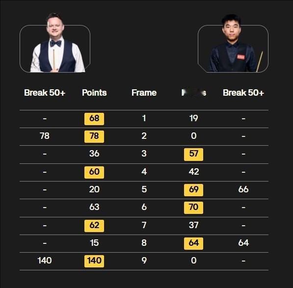 首阶段战况:范争一4-5墨菲,关键局在第9局墨菲轰出140分清台,一举拉开优势。
