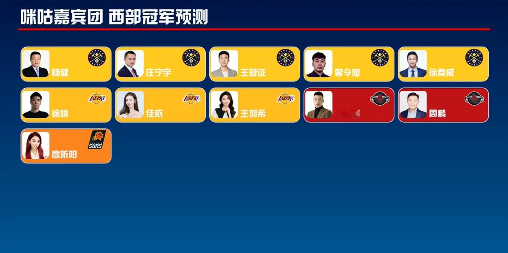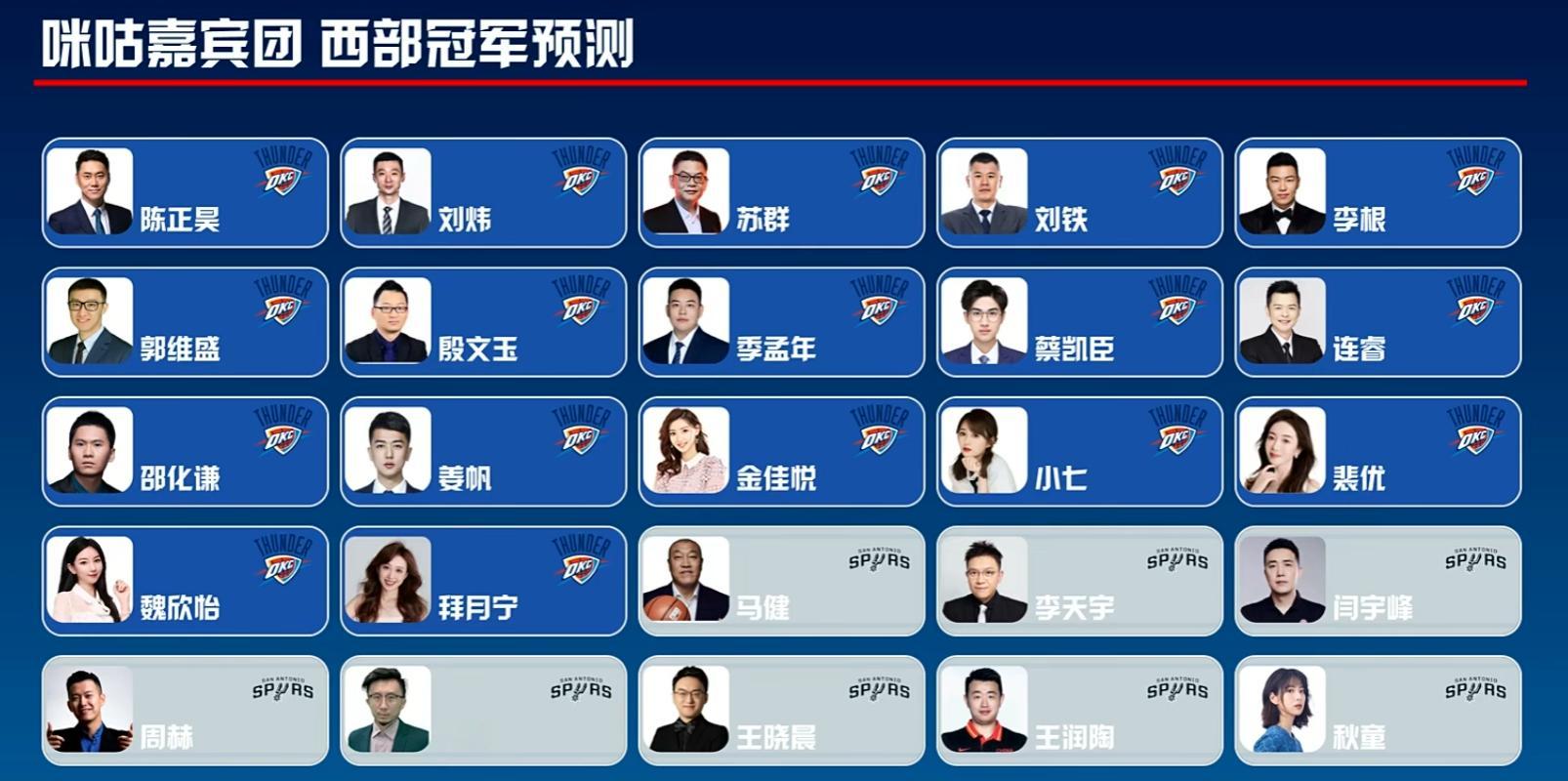 咪咕主持与嘉宾预测西部冠军归属,17人选雷霆,8人选马刺,5人选掘金,3人选湖人