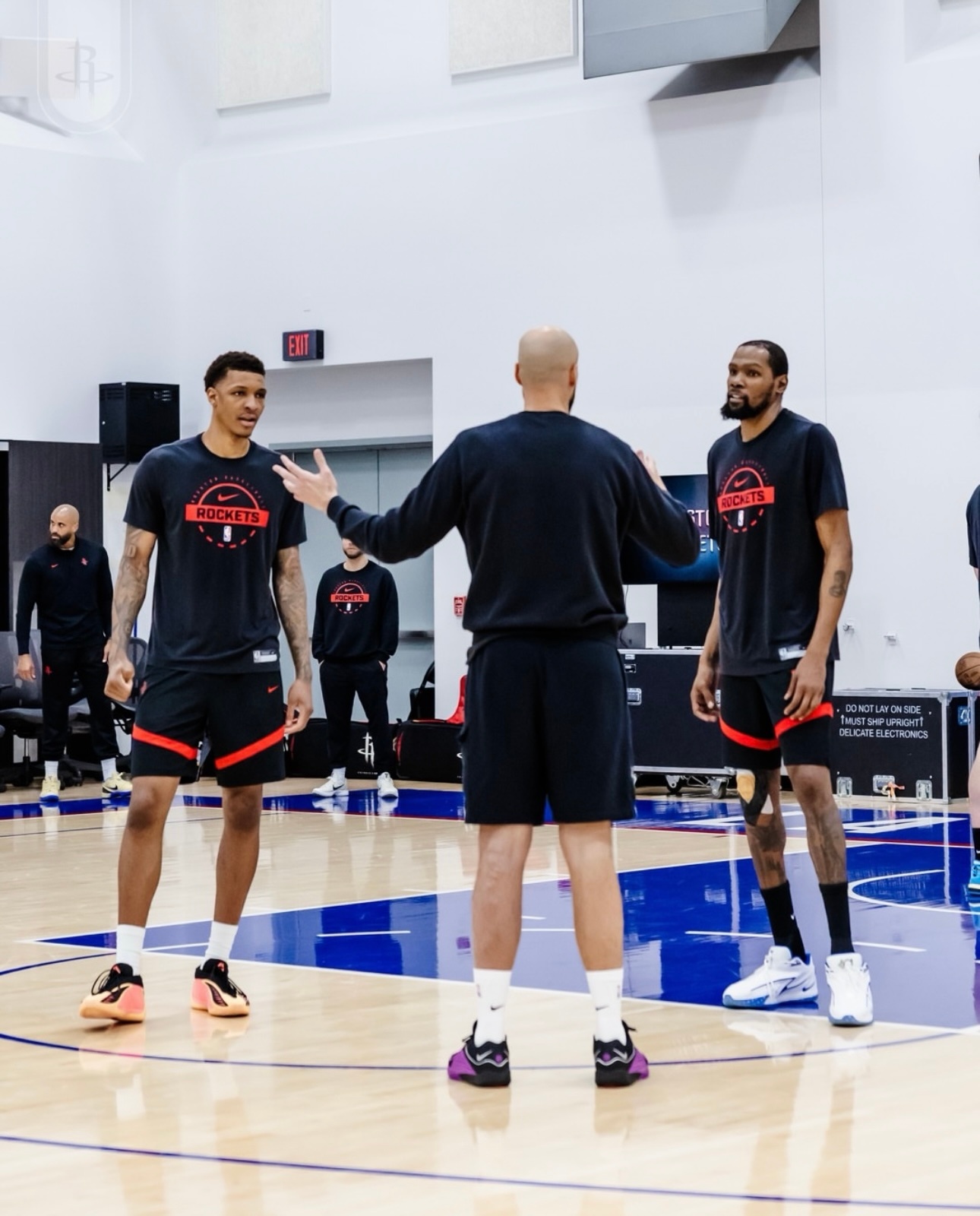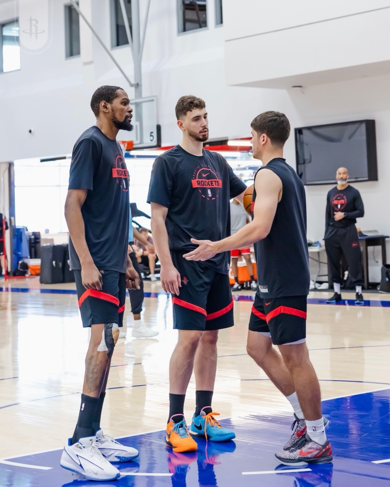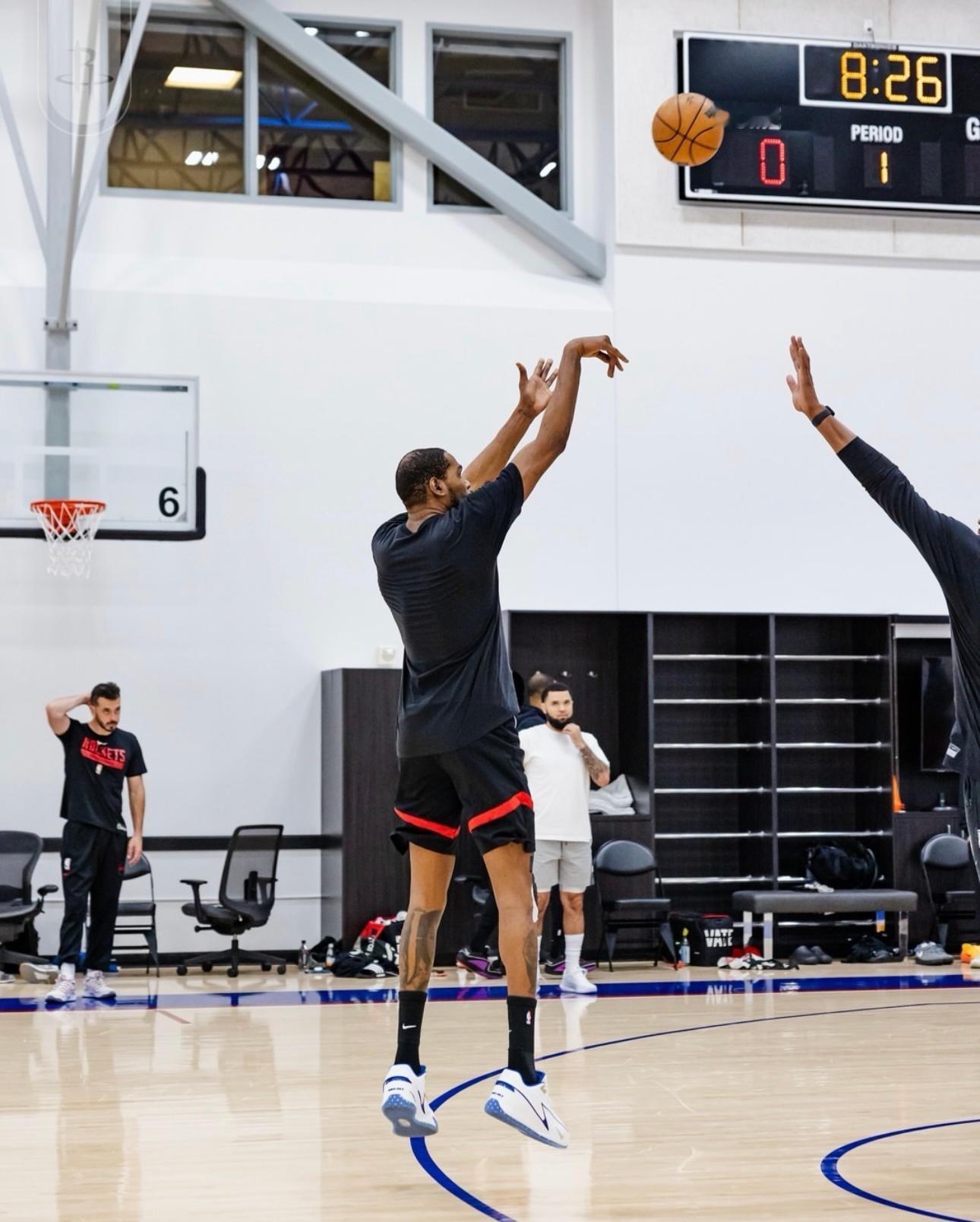 火箭今天训练,杜兰特全程参与,有伤的右膝上绑着护膝,没有发现明显肿胀。