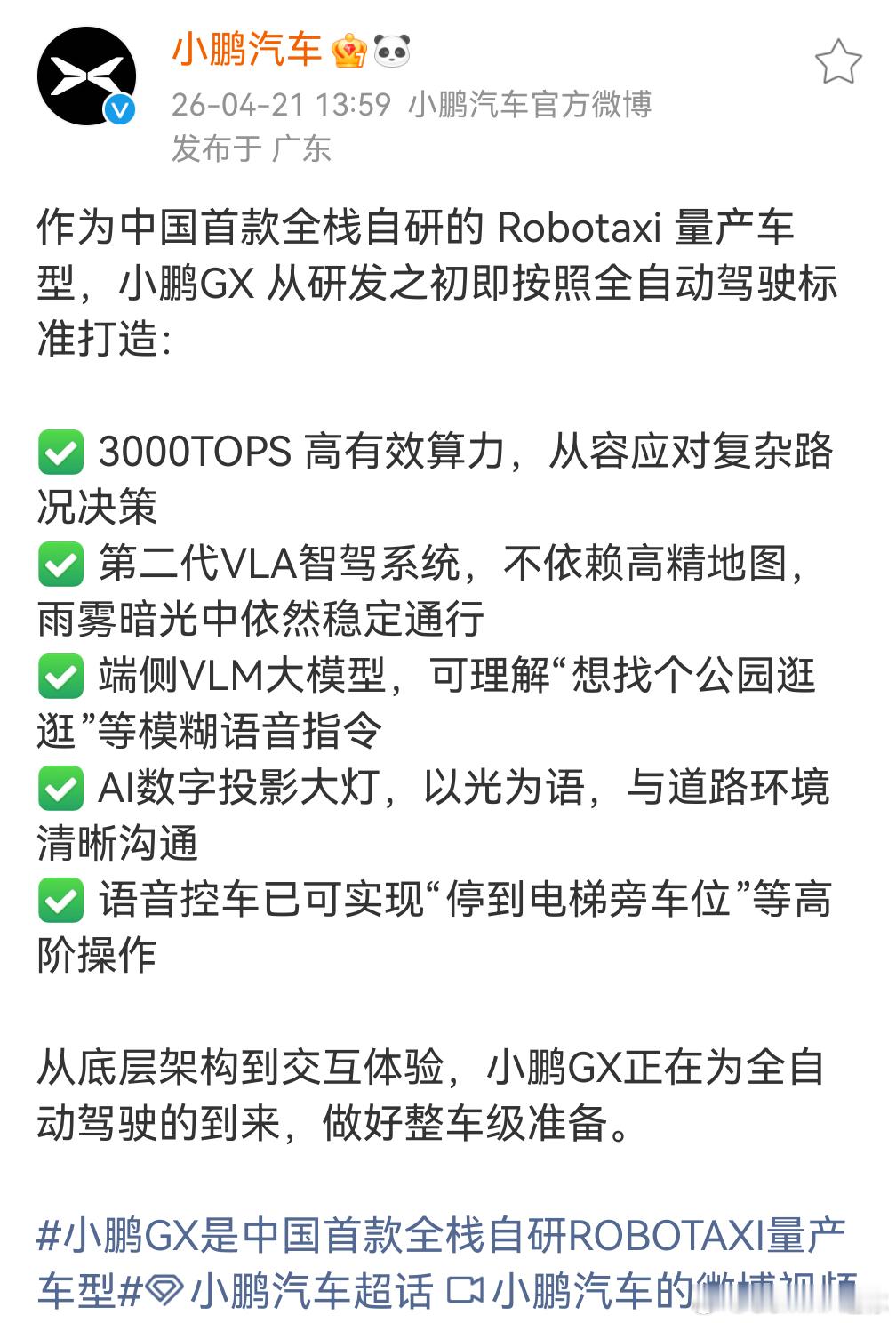 下午小鹏这边发了个话题:小鹏GX是中国首款全栈自研ROBOTAXI量产车型