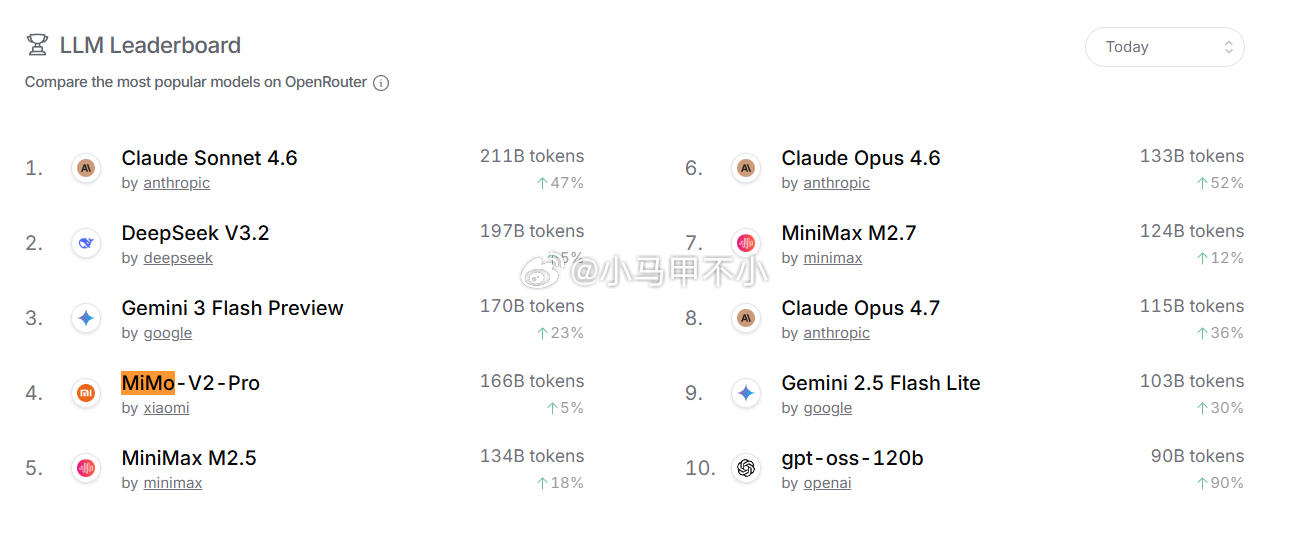 mimo调用量今天第四,细分领域第一