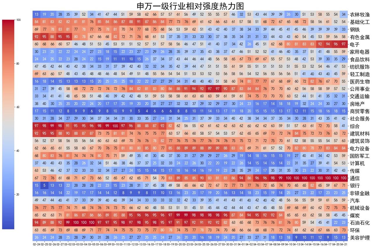每个小格子代表某个行业在当天的强度,数值介于0-100之间,强度大于50者值得多花一些精力。