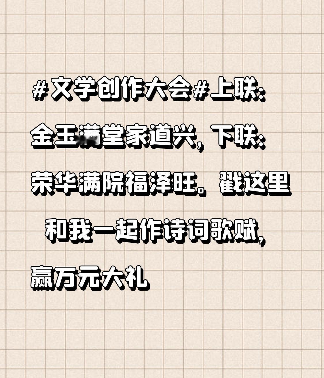 文学创作大会 这副“金玉满堂家道兴,荣华满院福泽旺”的对联简直绝了!对仗工整,寓意超棒,把对家庭兴旺、福气满满的期盼都写出来了。