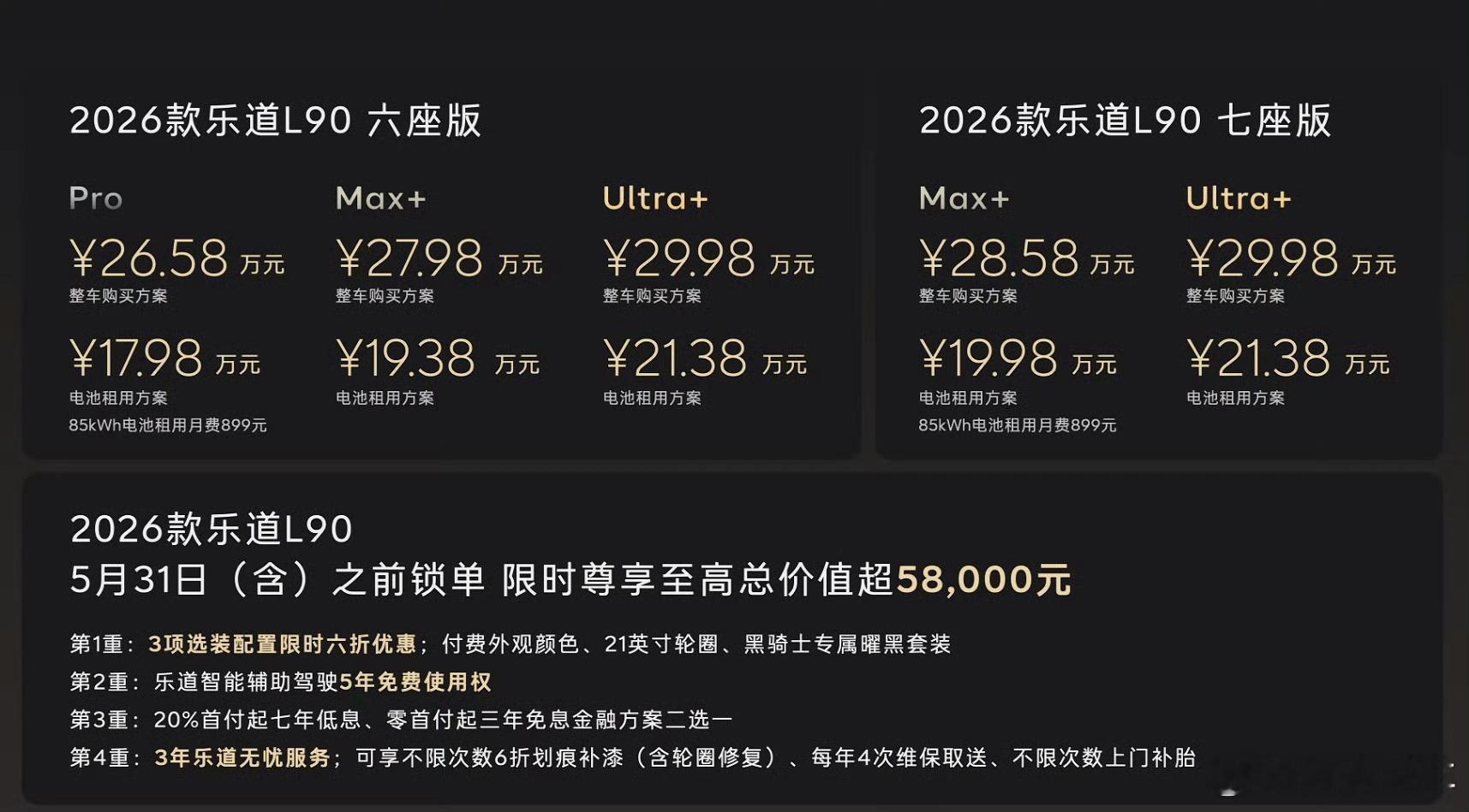 六座版本:整车购买:26.58—29.98万;租电方案:17.98—21.38万;