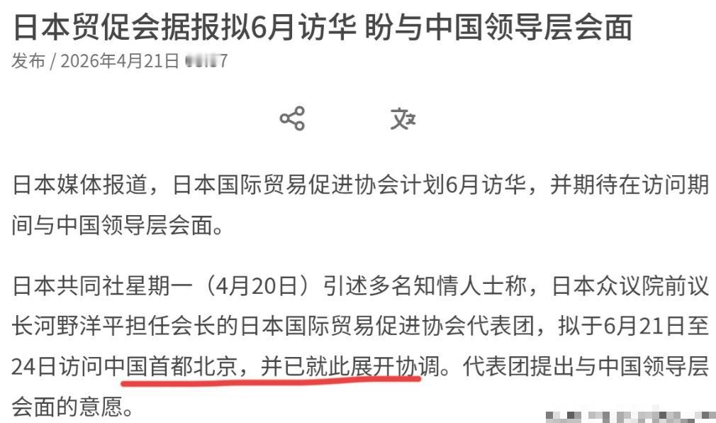 4月21日,根据日本共同社报道,日媒援引多名知情人士称,日本众议院前议长河野洋平担任会长的日本国际贸易促进协会代表团,拟于6月21日至24日访问中国首都北京,并已就此事展开协调。该代表团表示,他们希望与中国领导层会面,希望中方能够同意。