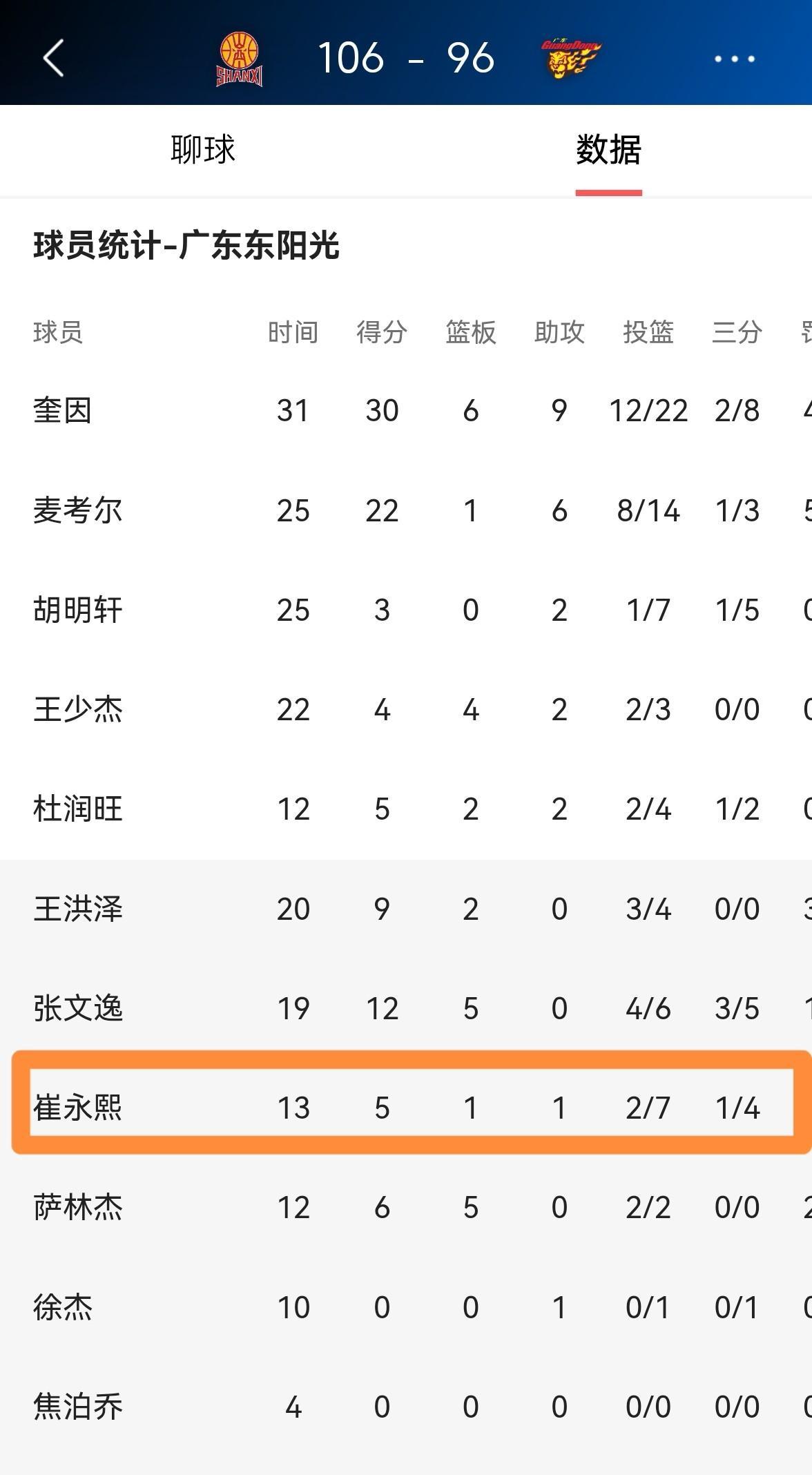 作为替补出战的13分钟里,崔永熙的表现实在让人意外,7次出手只命中2球,三分线外4投1中,全场下来只有5分进账。