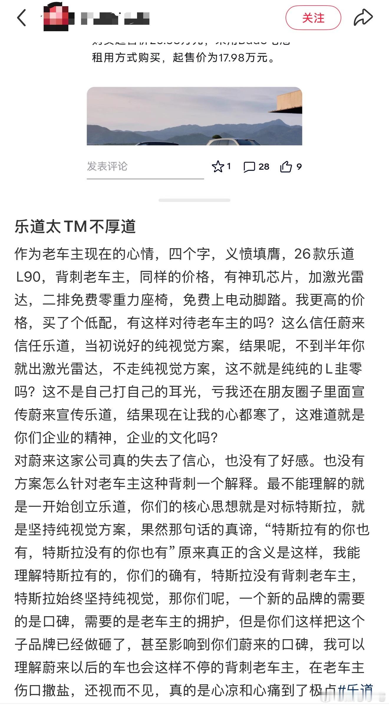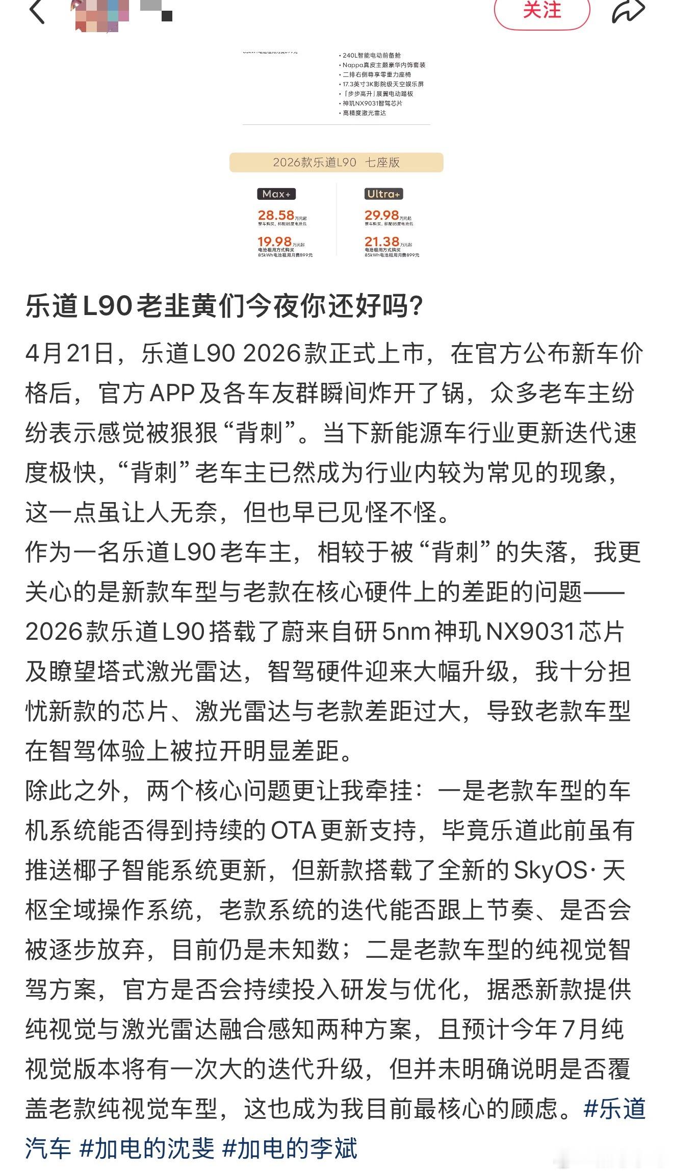 乐道L90价格虽然这个品牌主要都是租电的,但是你也不能一个月899啊,比油车都贵了。看了不少老车主的帖子,都是骂声一片