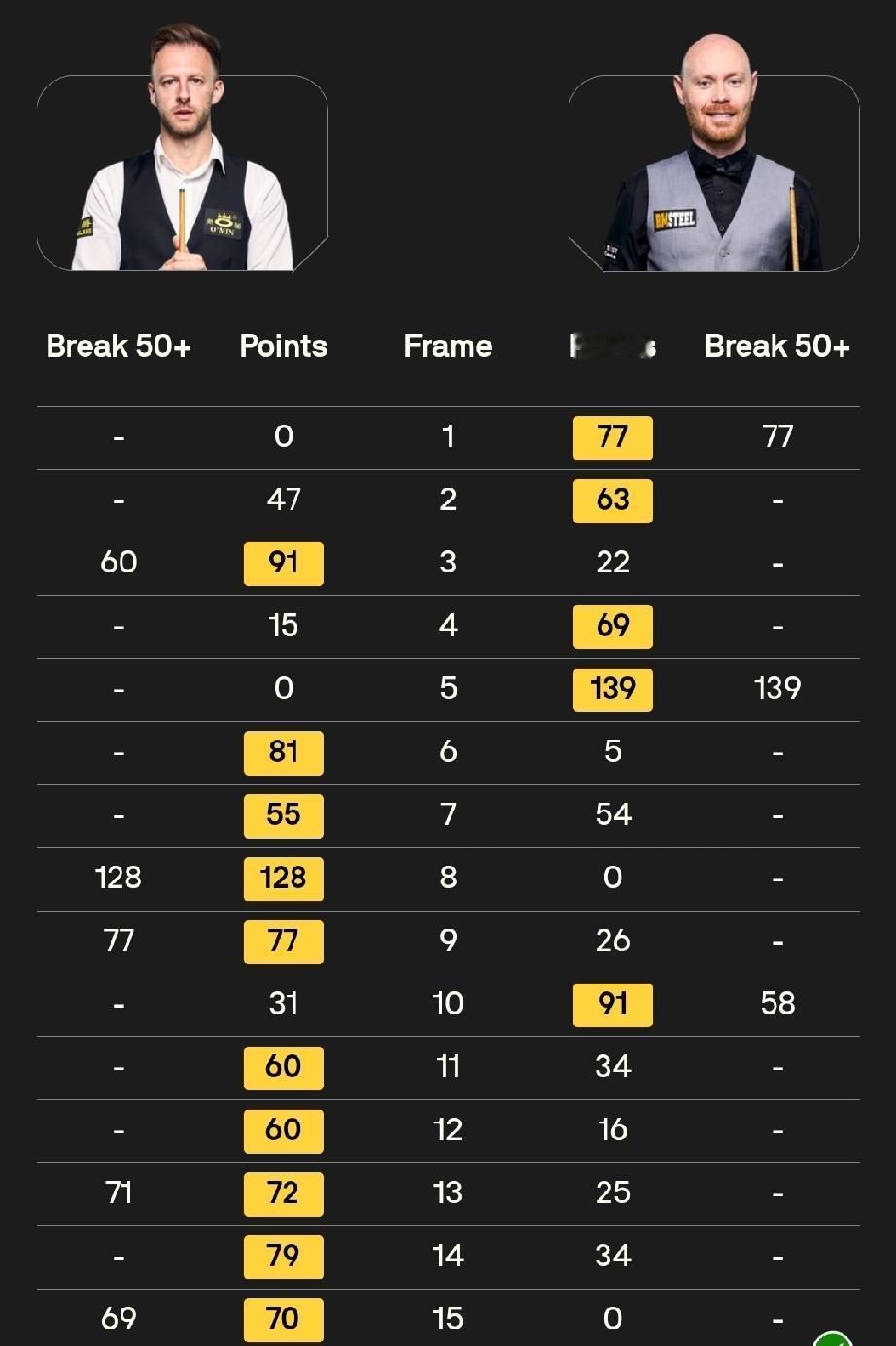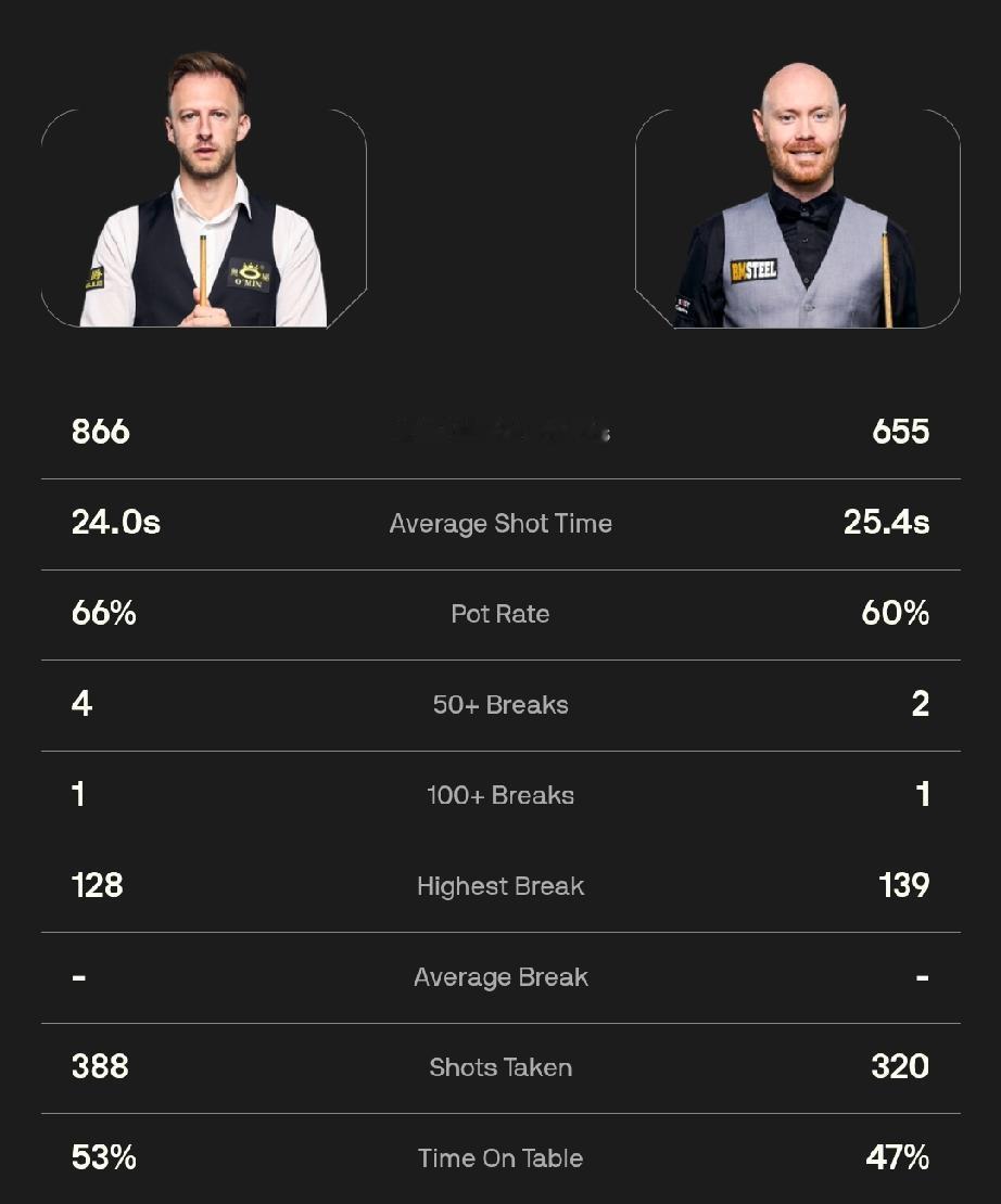 昨天,在世锦赛正赛首轮第一阶段比赛中,威尔逊开局发挥出色,打出单杆139分,4-1领先特鲁姆普。随后,特鲁姆普接管了比赛,打出单杆128分连赢五局,5-4领先结束第一阶段比赛。