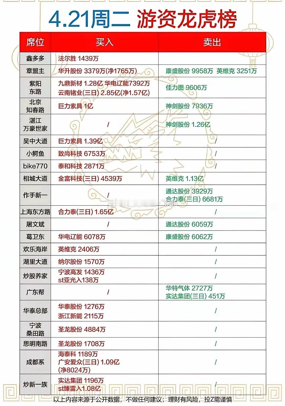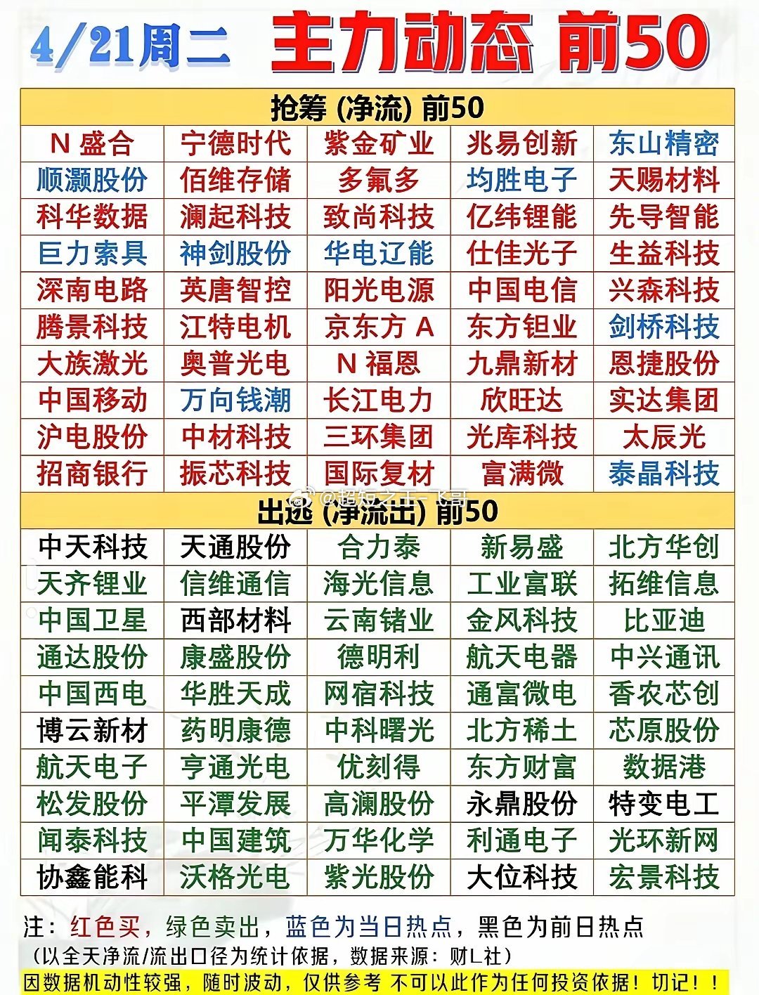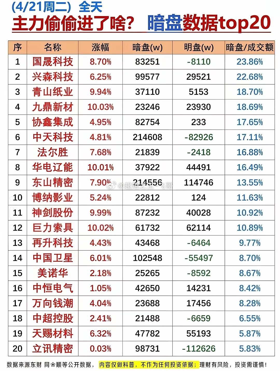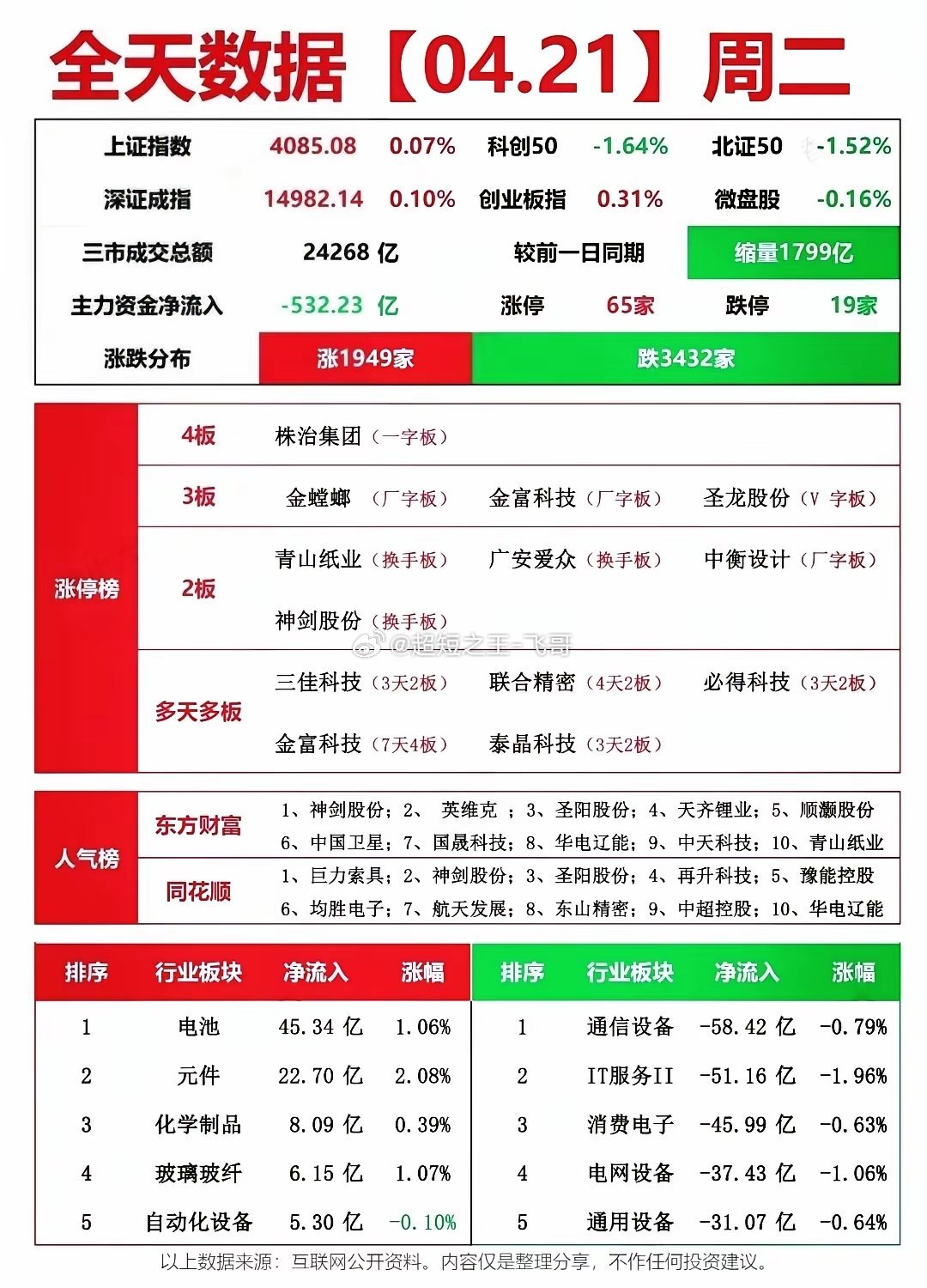 4月21日A股全天复盘资料来了!今天三大指数涨跌不一,三市成交总额缩量至24268亿,主力资金净流出532.23亿,个股跌多涨少,涨停65家、跌停19家,市场情绪整体趋于谨慎。资金流向层面,主力资金调仓换股特征显著。电池、元件、化学制品等板块获主力净流入,成为当日资金避风港;个股端,N盛合、宁德时代、紫金矿业等个股获主力大额净流入,而立讯精密、润泽科技、天孚通信等个股资金出逃明显。暗盘数据与游资动向进一步印证市场节奏变化。国晟科技、兴森科技、青山纸业等个股暗盘成交额占比居前,资金潜伏意愿浓厚;游资席位上,章盟主、作手新一、炒股养家等顶级游资现身,章盟主买入九鼎新材1.28亿、华电辽能7392万,作手新一卖出英维克1.13亿,游资分歧与切换加快。涨停梯队中,商业航天、AI硬件、国产芯片成为核心主线。株冶集团走出4天4板业绩龙头,金富科技7天4板、泰晶科技7天3板领跑AI硬件,金螳螂、圣龙股份斩获3天3板,商业航天板块的神剑股份、联合精密等个股也强势连板。整体来看,当日市场缩量调整下科技主线分化加剧,资金聚焦高景气细分赛道,后续需关注量能能否有效修复以及主线板块的持续性。