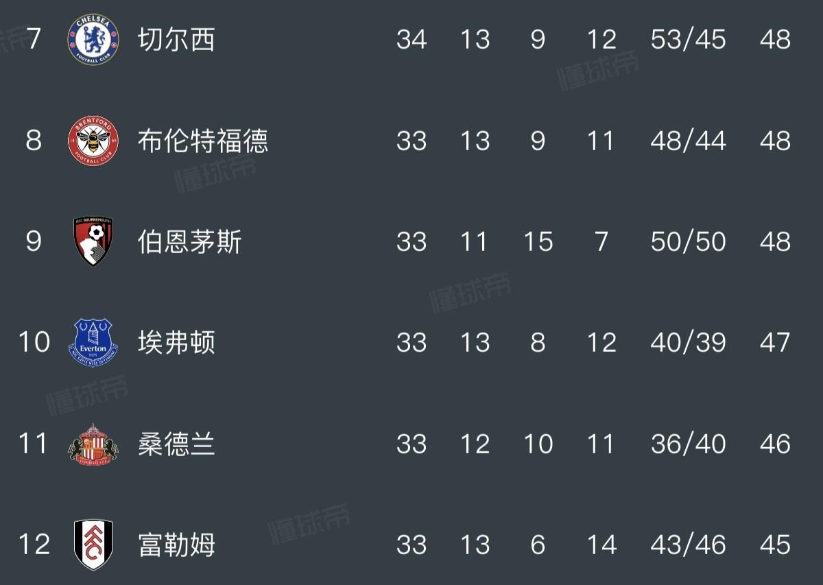 由于第8的布伦特福德到第11的桑德兰和切尔西的分差都在一个胜场以内(图3),所以最坏的情况是本轮踢完以后,切尔西的排名可能掉入下半区,彻底无缘欧战资格!切尔西
