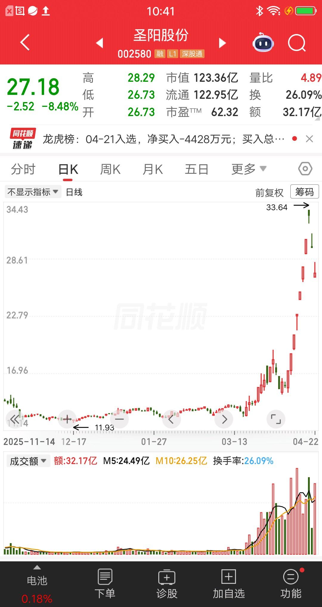 圣阳股份周一尾盘炸板,周二跌停闷杀,确实有点惨烈呀。今天再度一字跌停,他觉得机会来了,竞价就去抢筹。竞价结束看了一眼交易记录,26.73元成交1500股。开盘以后地板被撬开,他有点小开心,说明自己的买点没问题。心想如果后面再跌,就继续加仓。