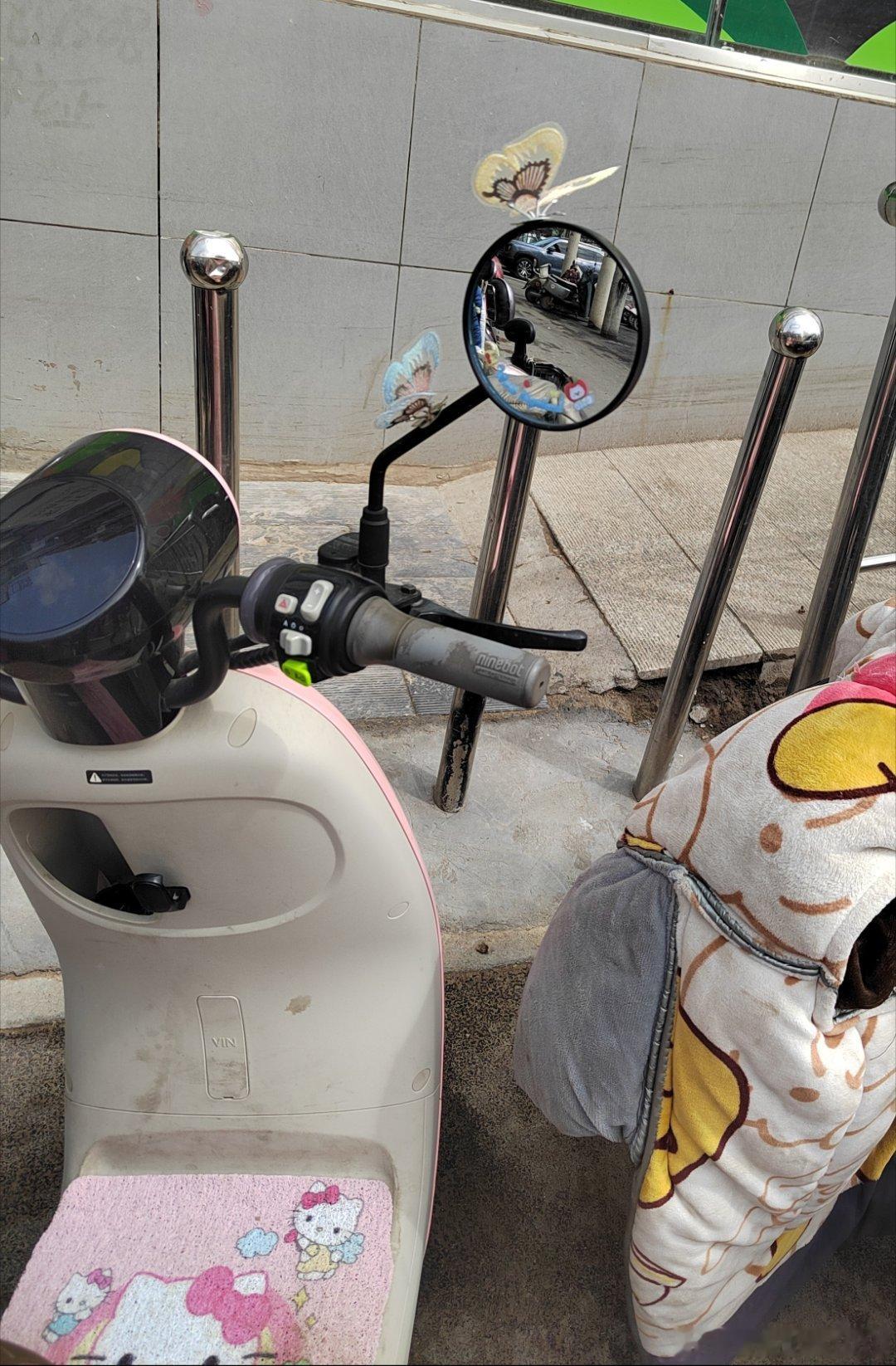 每侧的后视镜上都停着两只美丽的蝴蝶,车把上的手机支架、软乎乎的Hello Kitty脚垫,每一处细节都透着松弛又可爱的气息。