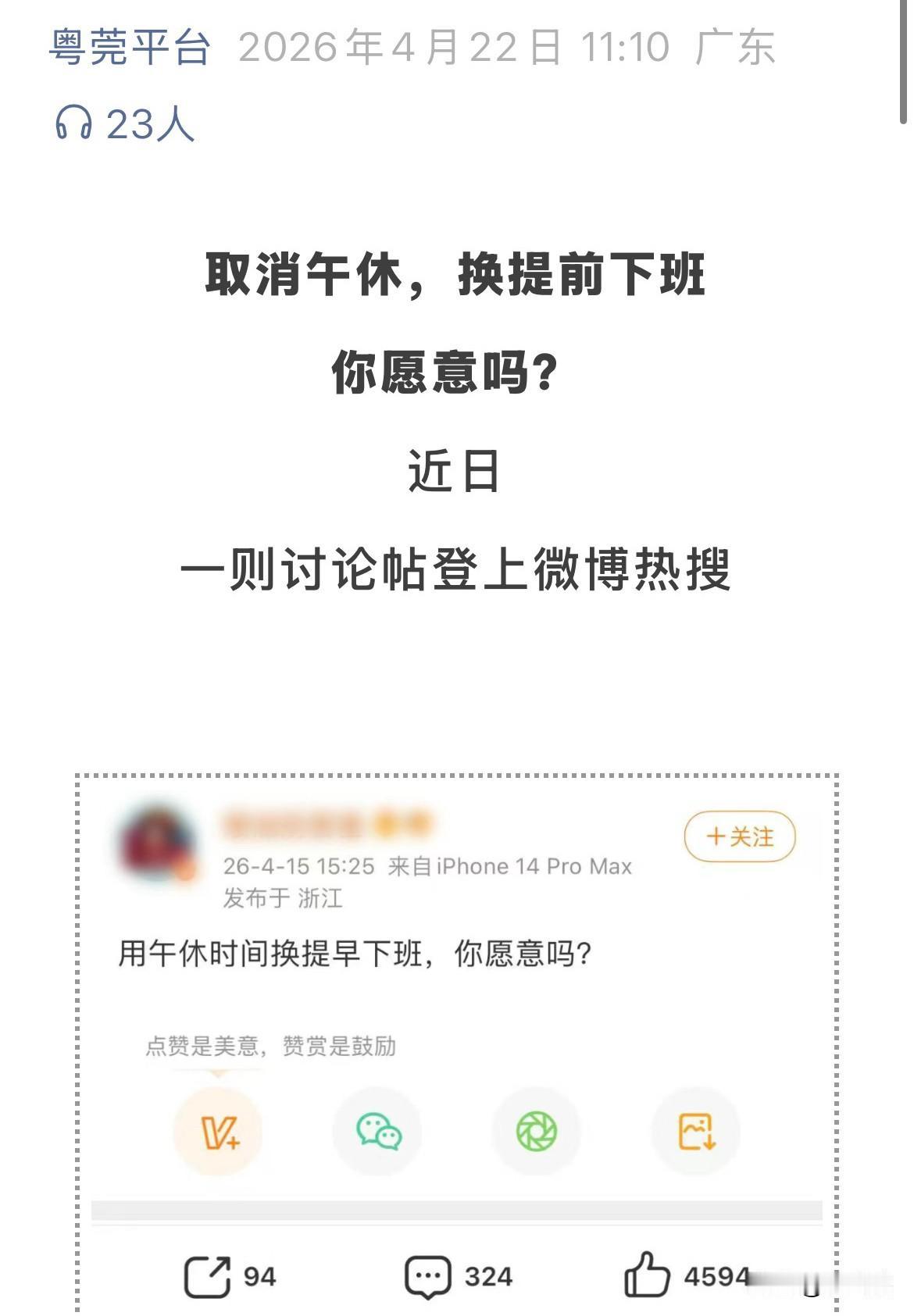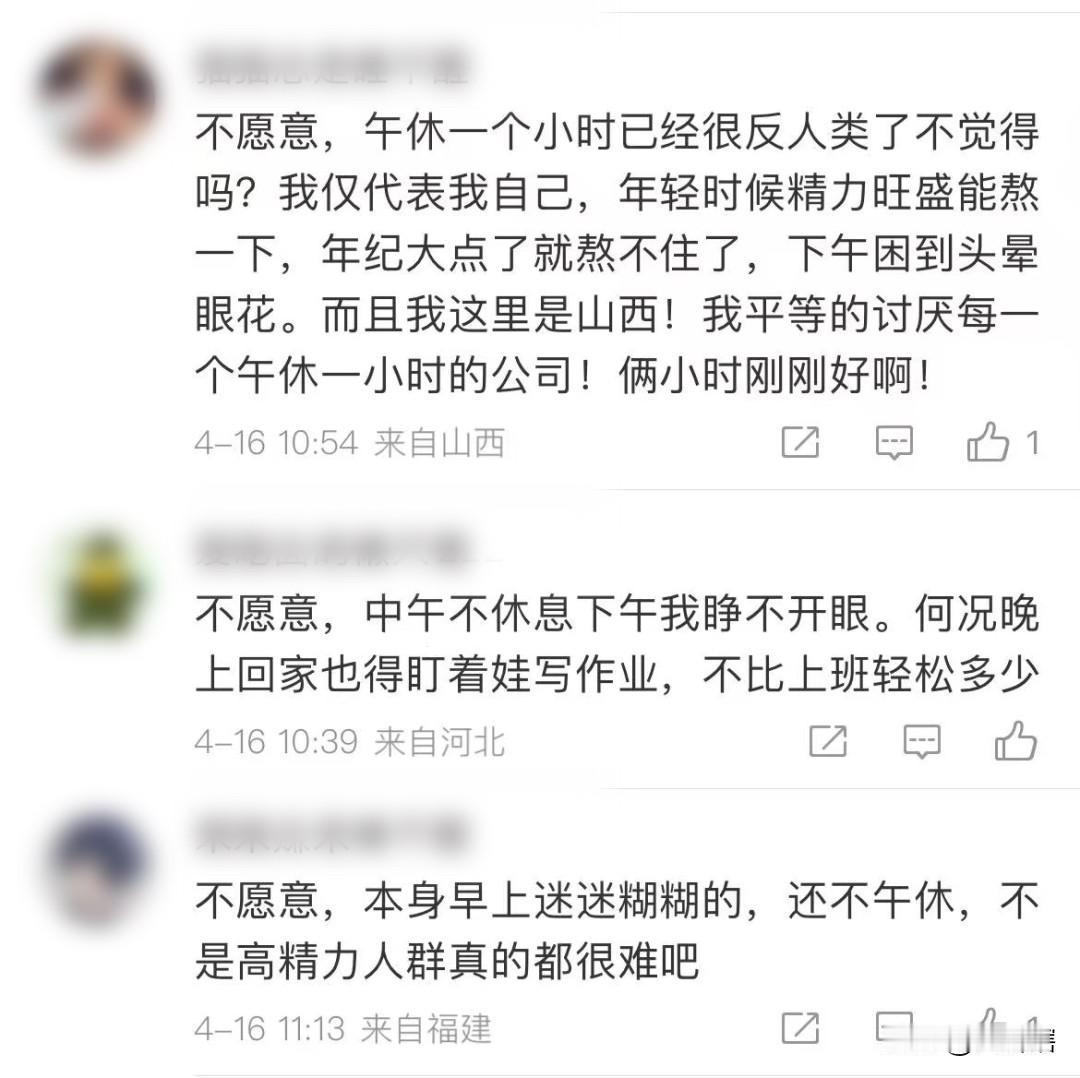 有网友在社交发文表示,如果用午休时间换取提前至16点下班,有多少人愿意这样做。评论区异常热闹,有人支持有人反对。