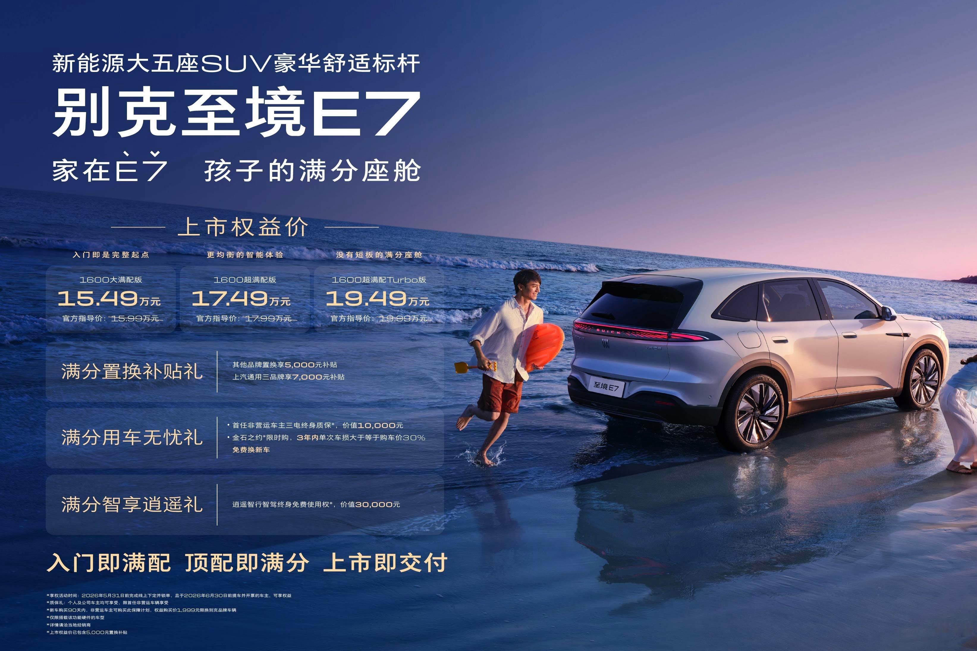 今天上市的新车很多,别克至境E7先出牌。一共上市3个版型,指导价15.99-19.99万元,权益价后15.49-19.49万元。
