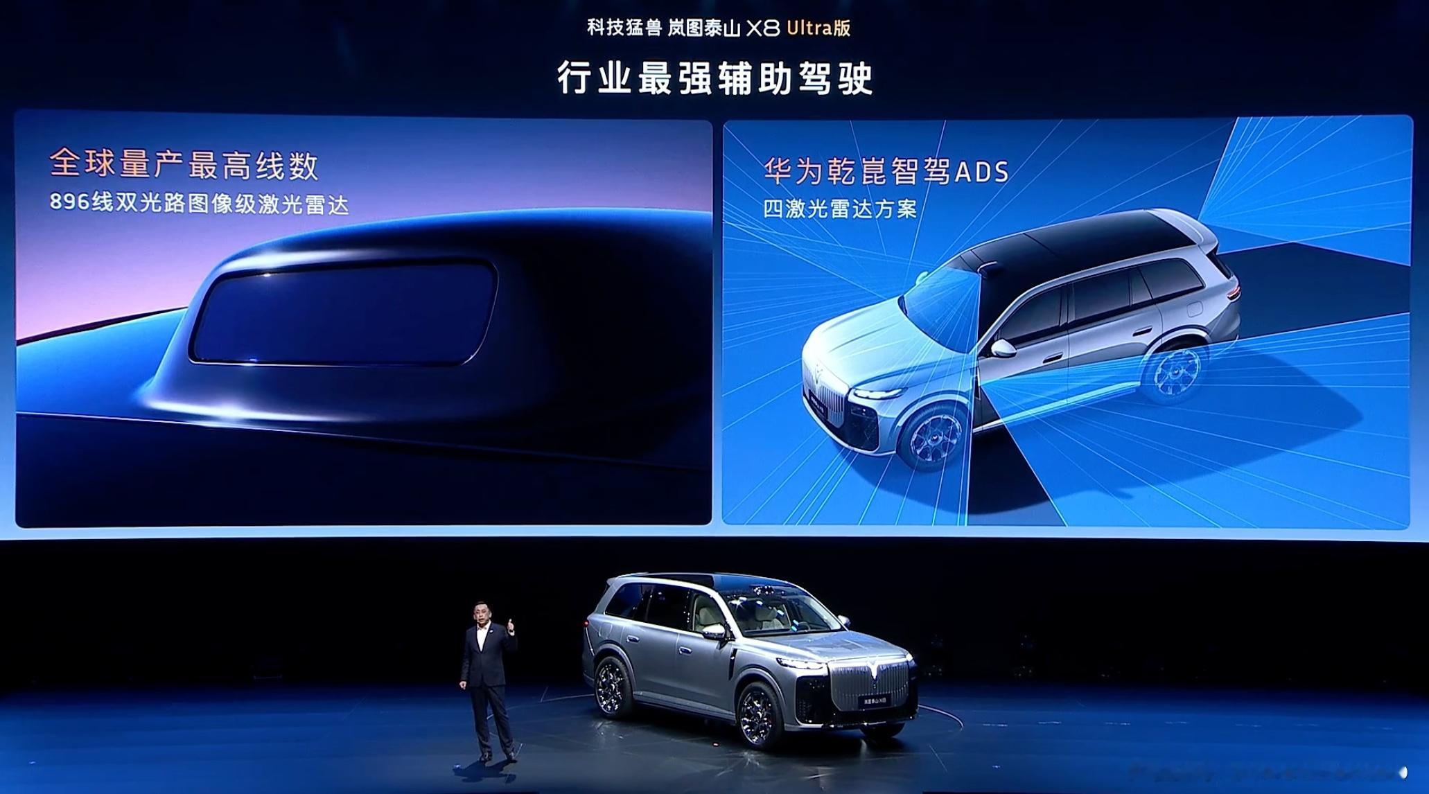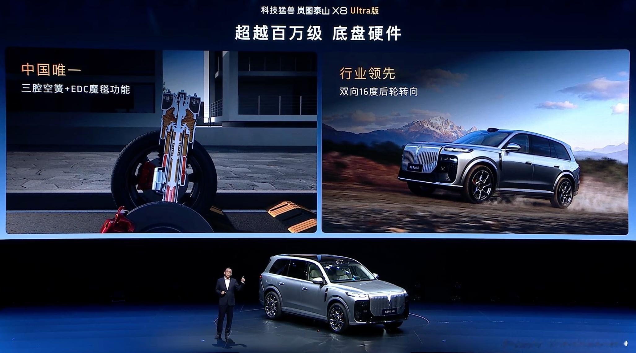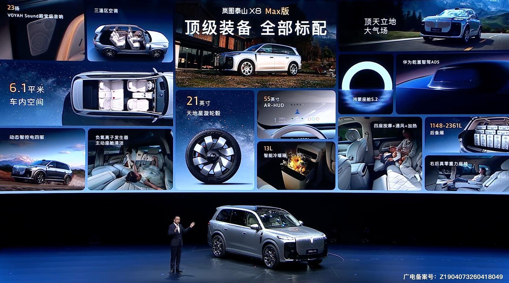 岚图泰山X8发布,定位大五座SUV,车长5.2米,车宽超两米。Max版标配鸿蒙座舱5.2,华为乾崑ADS,13升冷暖冰箱,负氧离子发生器等舒适和科技配置;Ultra版搭载896线双光路图像级激光雷达、三腔空簧+EDC魔毯功能、双向16度后轮转向等配置;Ultra +版搭载120度电池、全车电动门、二排真零重力座椅等进阶配置。