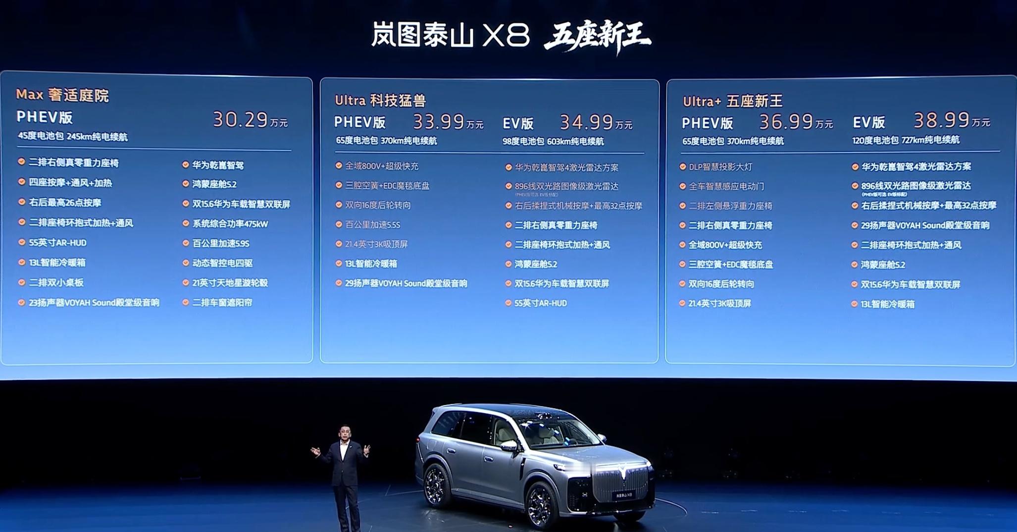 Max超混版预售价30.29万Ultra超混版预售价33.99万Ultra纯电版预售价34.99万Ultra+超混版预售价36.99万Ultra+纯电版预售价38.99万