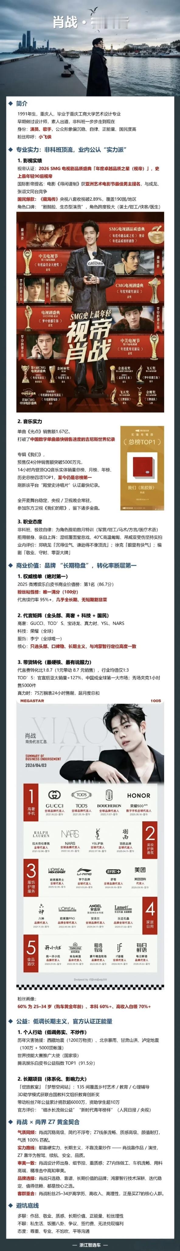 据公开信息,肖战位居2025微博娱乐白皮书商业价值榜第1名,粉丝粘性榜唯一满分,代言续约率超95%,几乎全为长期合作。
