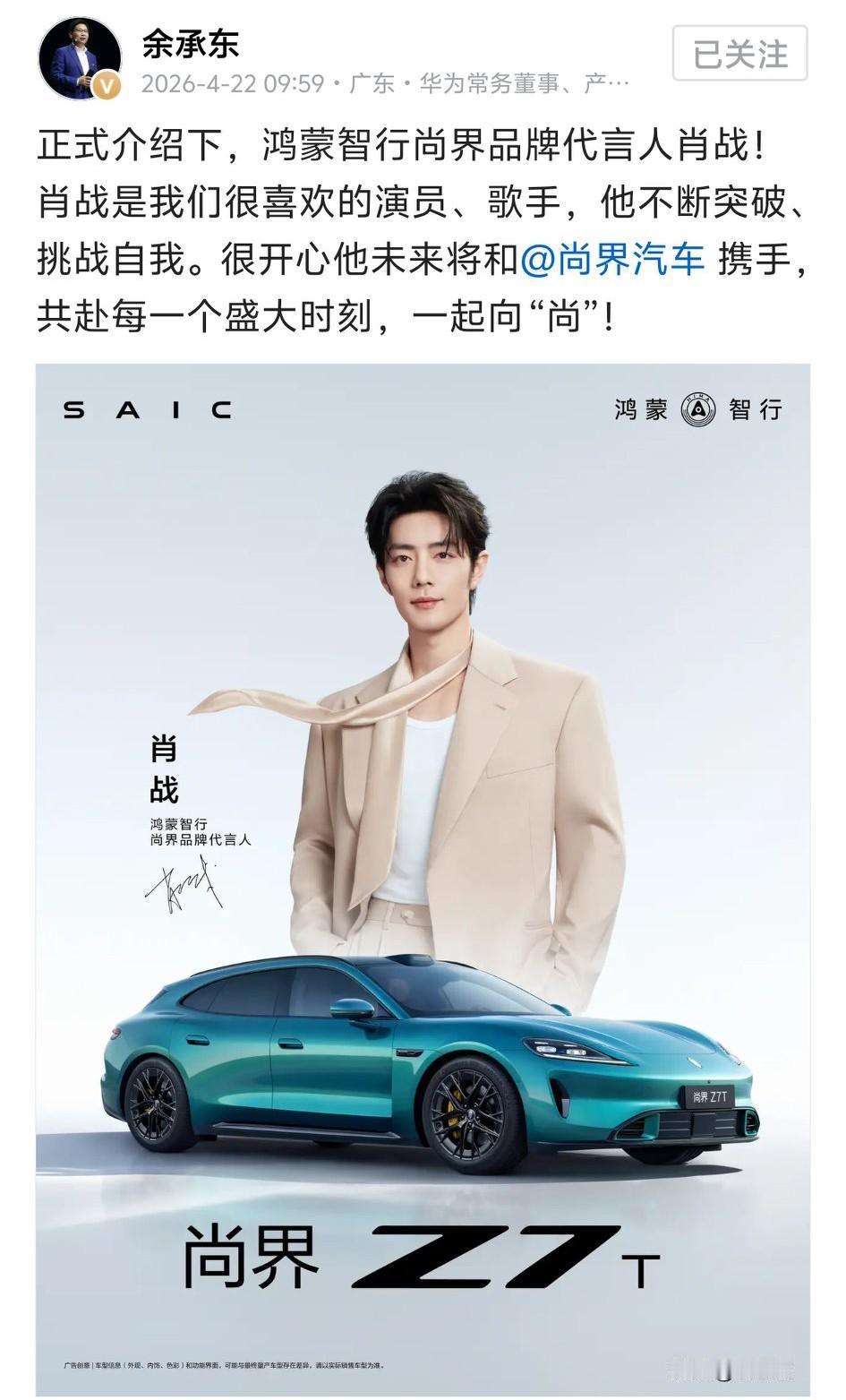 华为在浙江落地的官方授权店浙江智选车提供的一份“肖战微科普”显示,肖战的形象、演艺实力以及职业态度都与尚界汽车十分契合。最重要的是,他的代言转化率是普通明星的近3倍。