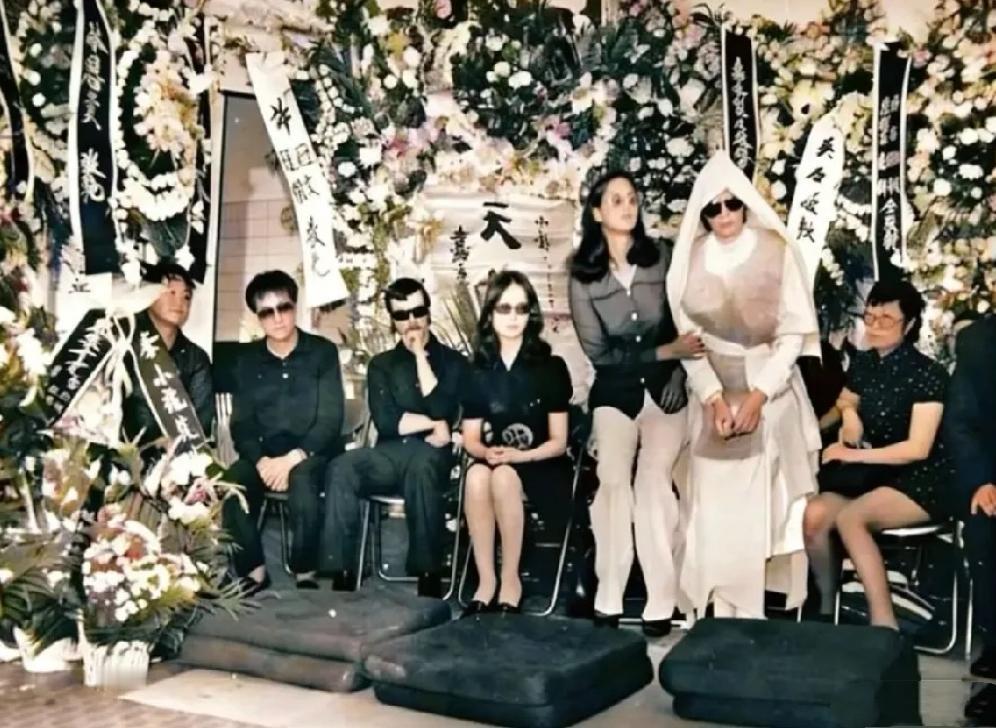 1973年,李小龙葬礼上的一张老照片,葬礼上摆满了花圈,披麻戴孝由人搀扶着的是妻
