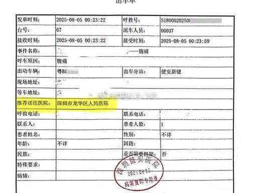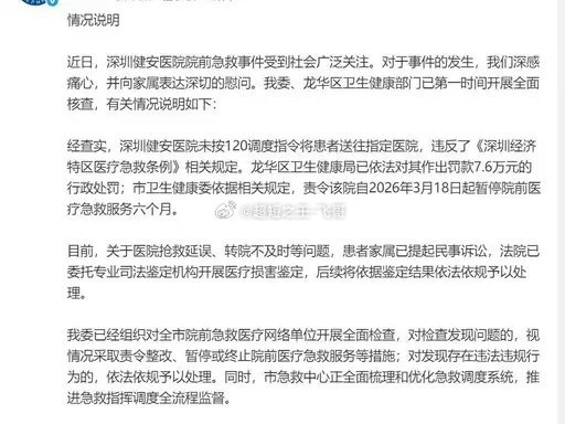 刷到姚晨icon那条微博,老陈我愣了一下。不是吃瓜,是真出事了。深圳icon一个54岁的张女士,去年八月突发腹痛打120。按指令该送龙华区人民医院,救护车愣是把她拉去了别家。一家民营的健安医院。家属求转院,不让。求领导,跪下了。等到终于转走,人已经没了。姚晨发文说,她家至亲也叫过急救车,被及时救回来,至今感念在心。急救人员是第一个跟死神抢人的人,能抢一个是一个。这种草菅人命的救护车,肯定是极少数。但落到一个家庭身上,就是命。这话说得一点不冲,但字字扎人。老陈我特意去查了处理结果。卫健部门认定,连续两次违反调度指令,性质恶劣。罚款7.6万,停急救资质半年。没了。一条命,7万6。你讲这事怪谁?怪司机?怪医院?还是怪规矩太软?人命关天的事,罚点钱了事,下次谁敢保证不再出。姚晨说极少数,老陈我信。但极少数落到谁家,谁家天就塌了。话说回来,你们觉得这处罚够不够?评论区讲一句。姚晨为救护车改道去世女子发声深圳急救车违规转运120截单