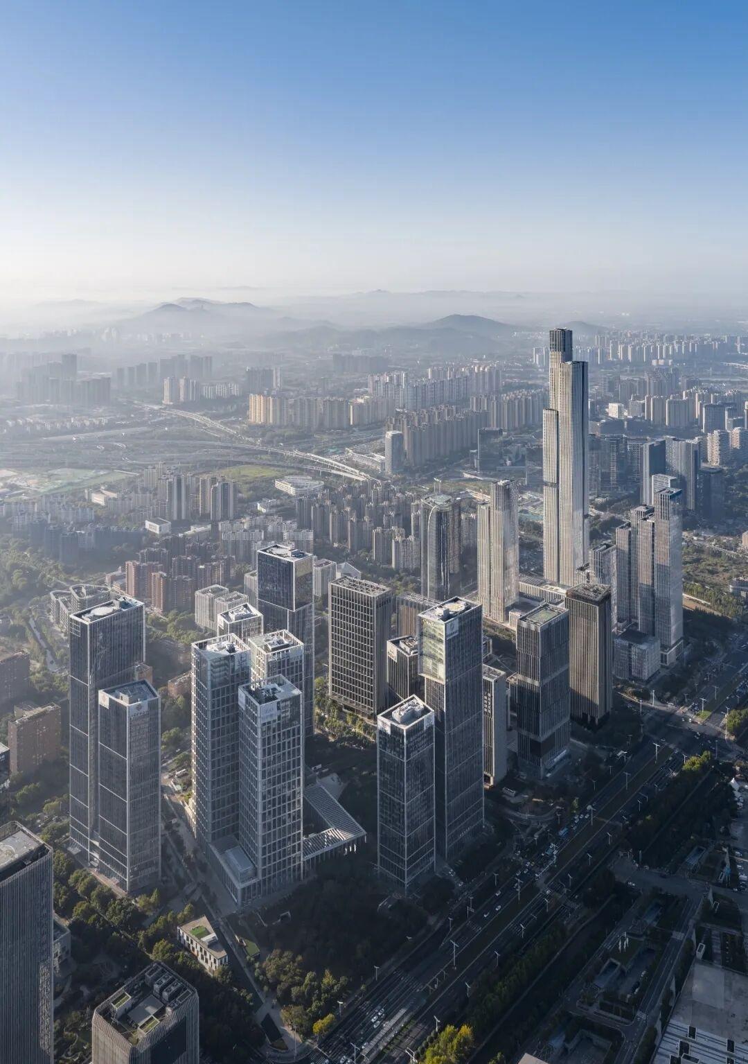 项目由德国gmp建筑师事务所操刀设计,其命名“紫金”兼具文化底蕴与美好寓意,既呼应了南京城市名片紫金山的地域标识,又暗合“紫气东来”的金融祥瑞内涵,实现了城市文脉与建筑功能的深度融合。建筑外观以冷峻的银色玻璃幕墙搭配利落清晰的竖向线条,勾勒出极具未来感的几何切割形态,三组错动的建筑体量通过纵向玻璃夹缝有机衔接,既保留了超高层建筑的挺拔气势,又打破了传统超高层的视觉沉闷感,成为河西天际线上极具辨识度的标志性建筑。