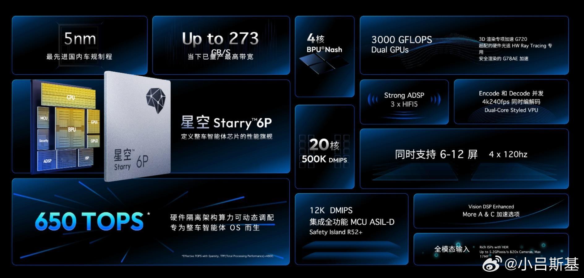 星空 Starry 6P 作为中国首款舱驾融合整车智能体芯片,以 5nm制程、650TOPS算力和273GB/s 带宽,迈入舱驾一体与中央计算时代。