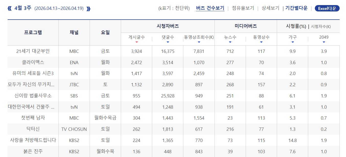 电视剧话题性热度排名:1.《21世纪大君夫人》2.《权欲之巅》3.《柔美的细胞君3》4.《努力克服自卑的我们》5.《神与律师事务所》6.《在大韩民国成为房主的方法》7.《第一个男人》8.《申医生》9.《爱情处方签》10.《红色珍珠》