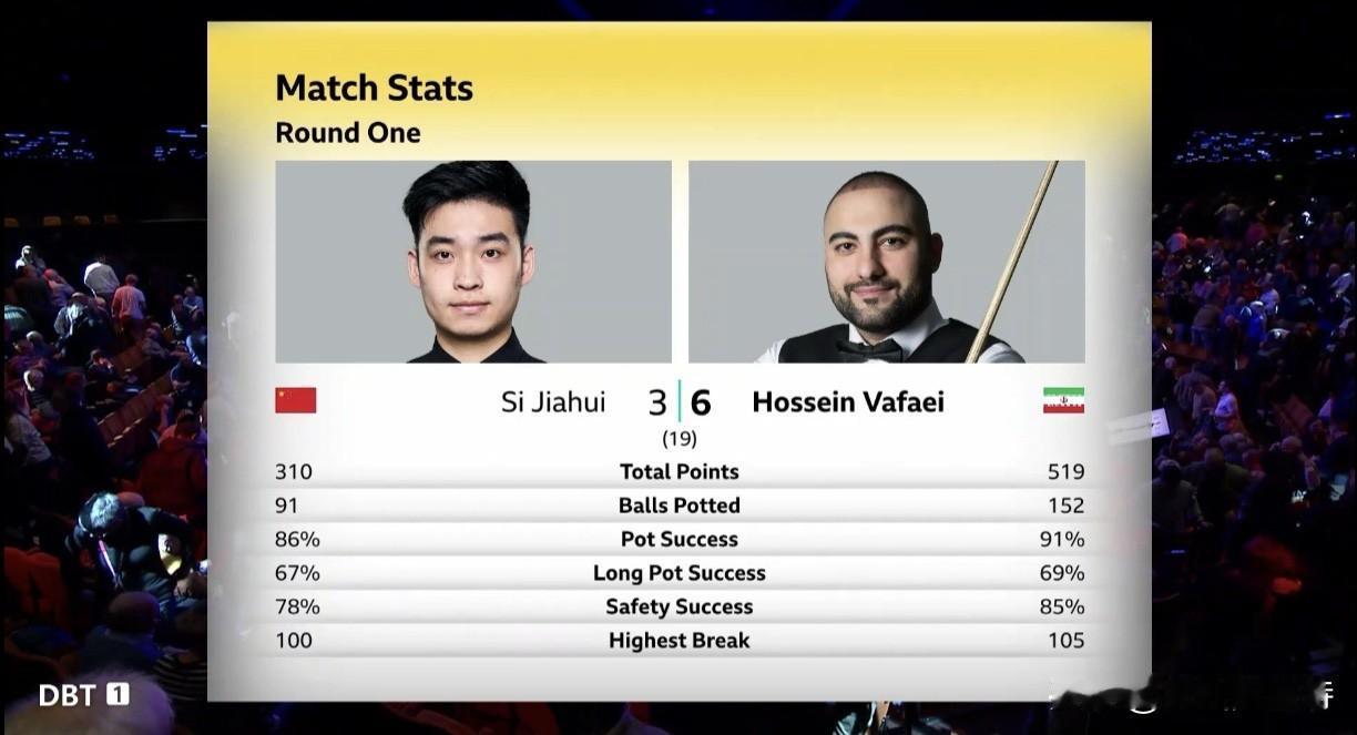 双方第一阶段打完,斯佳辉3-6落后,刚刚开始斯佳辉还打出不错的长台和手感,取得了3-1的领先,进入中场休息。