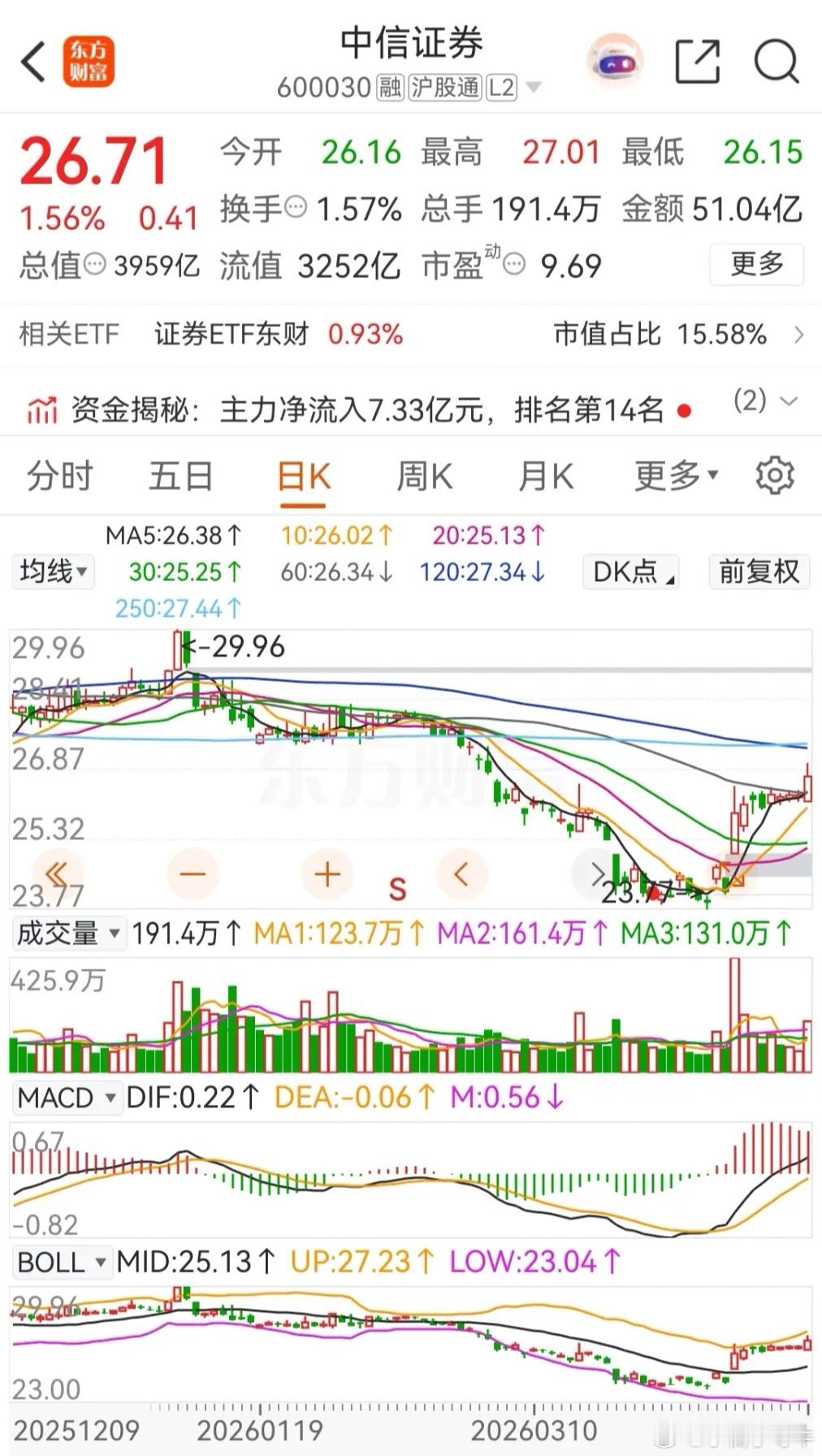 中信证券今天的走势和东财差不多,也是冲高回落,上涨了1.56%,报价26.71元。在资金流向上,今天被主力资金大幅净买入了7.3336亿元,连续两天被主力资金净买入,近五个交易日则是被主力资金合计净买入了约9.1044亿元。从走势上看,今天收盘时打破了之前横盘整理的态势,向上突破后站上了60日均线,整体走势强于东财!