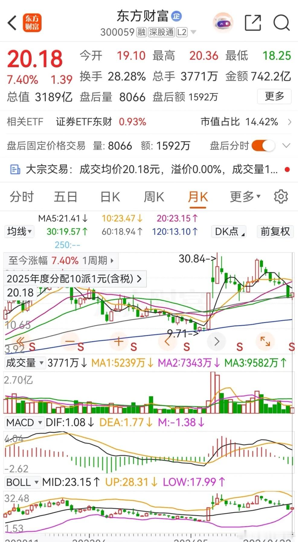 东方财富今天低开后震荡走高,临近午盘前冲高,午后有所回落,全天的涨幅为1.20%,收盘报价为20.18元。在资金流向上,今天被主力资金小幅净买入了约1.8141亿元,近五个交易日则是被主力资金合计净卖出了6.8997亿元。从走势上看,今天收盘站稳30日线,但大方向还是处于横盘整理态势之中。