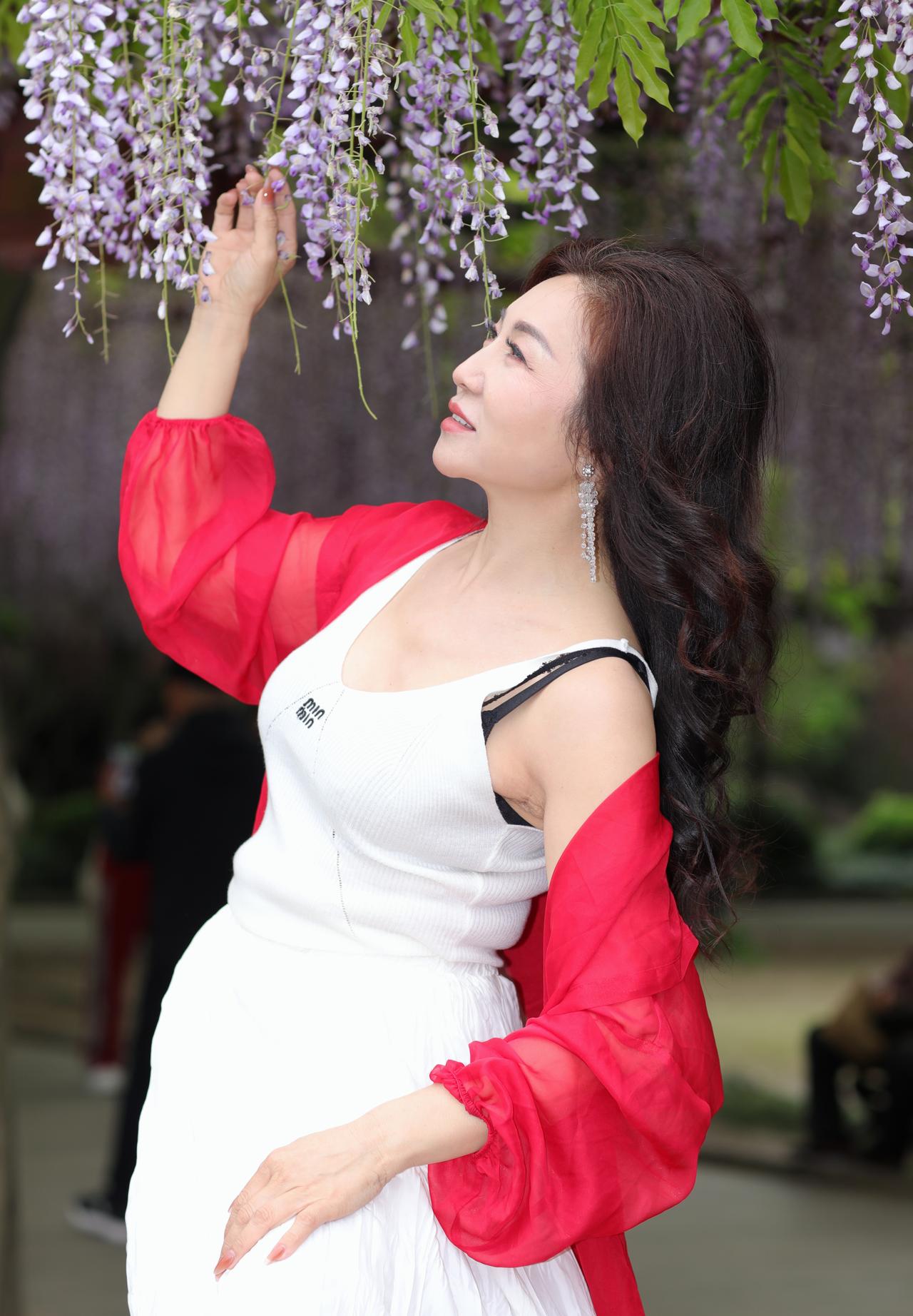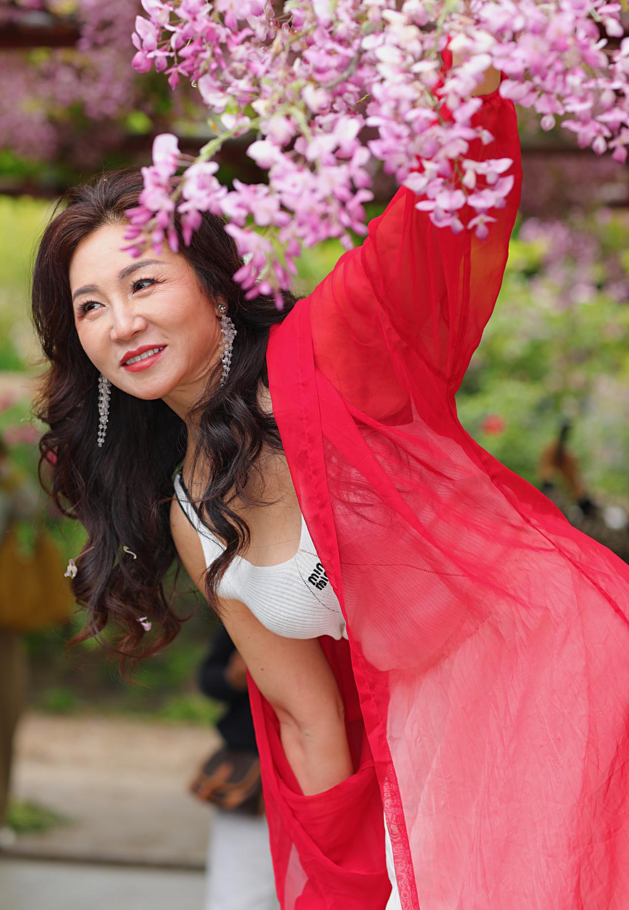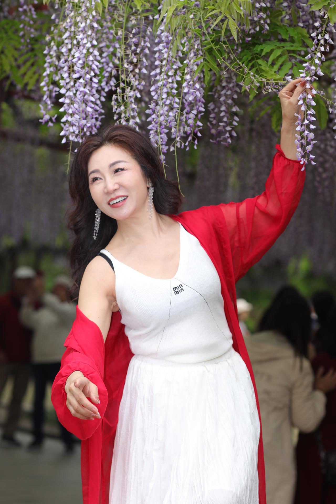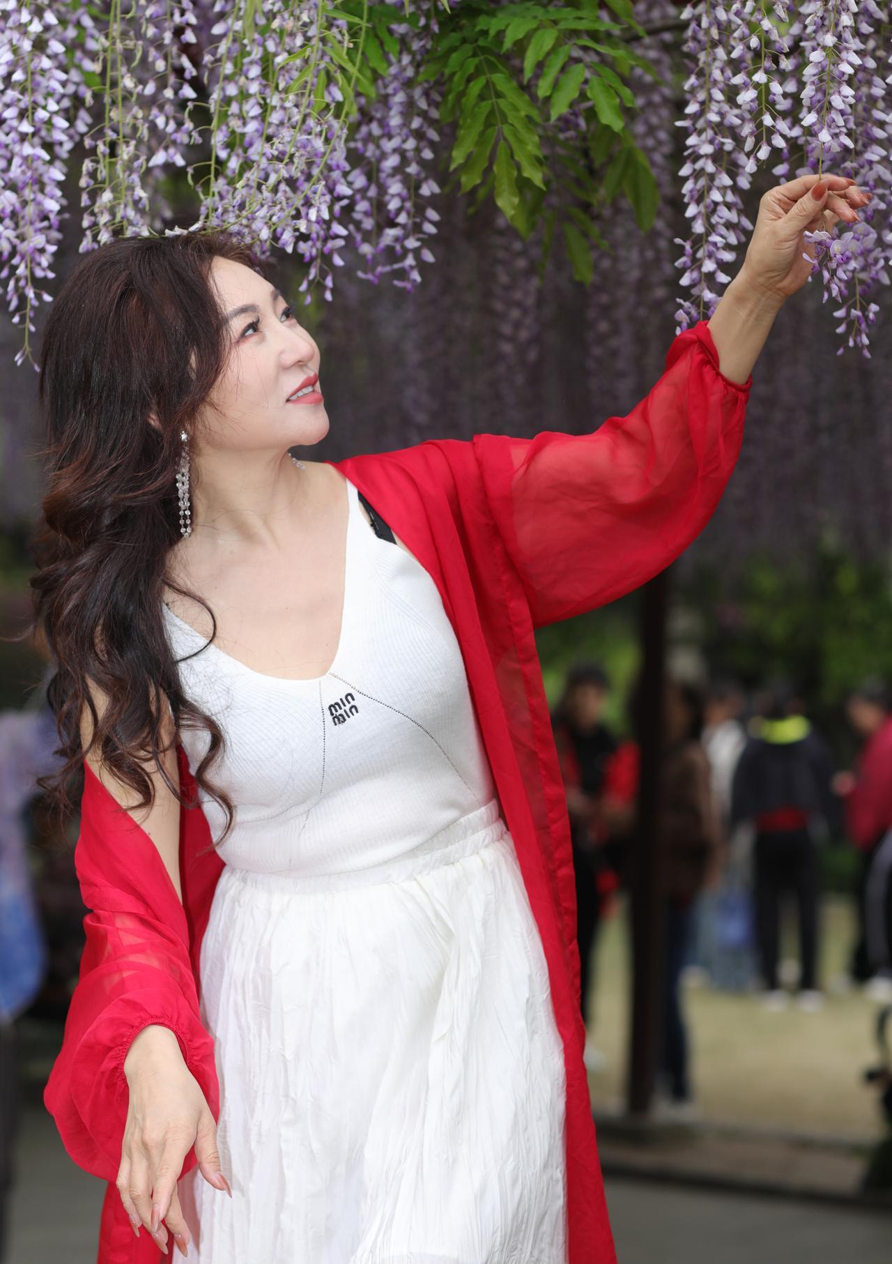 春风拂过紫藤花架,垂落的花穗像紫色的瀑布,在暖阳里漾着温柔的光晕。她一袭白裙衬得肌肤胜雪,外披一件飘逸的红纱,热烈的红与清雅的紫撞出明媚的春日色彩。她笑着伸手轻触花枝,眉眼弯成了月牙,耳间的碎钻耳饰随着动作轻晃,连风都染上了笑意。在这片花影里,她的自在与明媚,比春日的紫藤更让人挪不开眼,每一个瞬间都成了被温柔定格的诗。