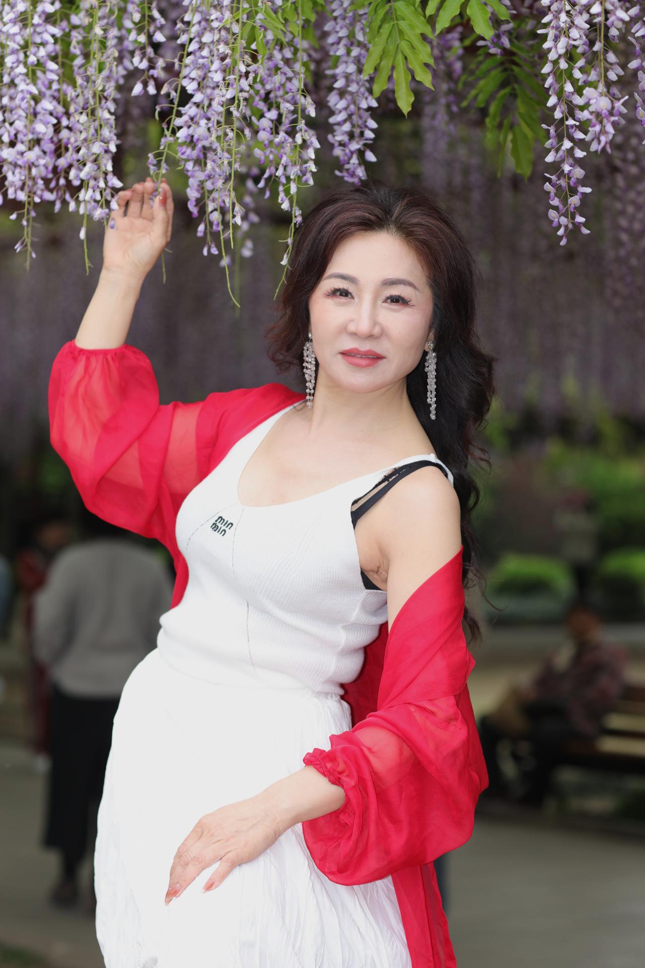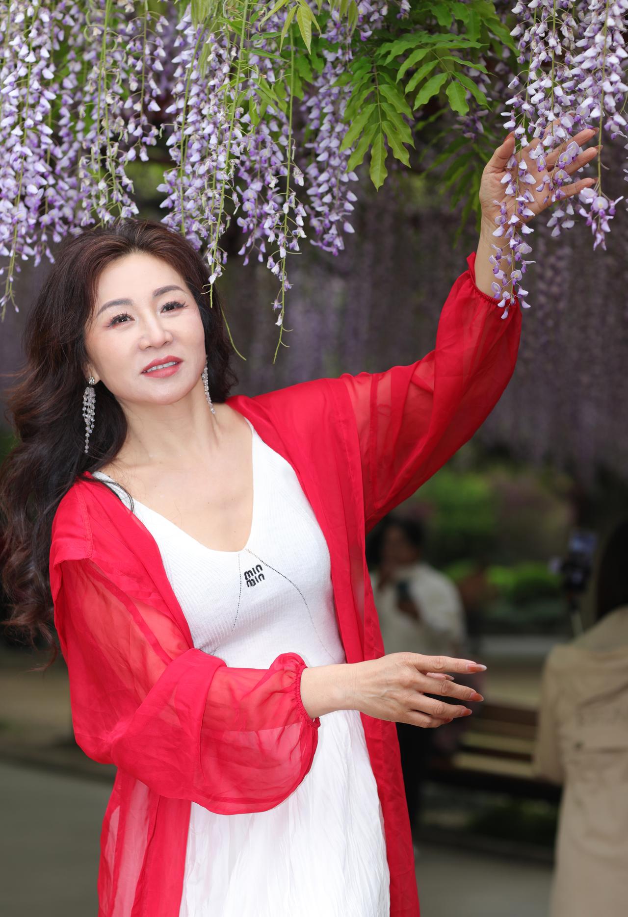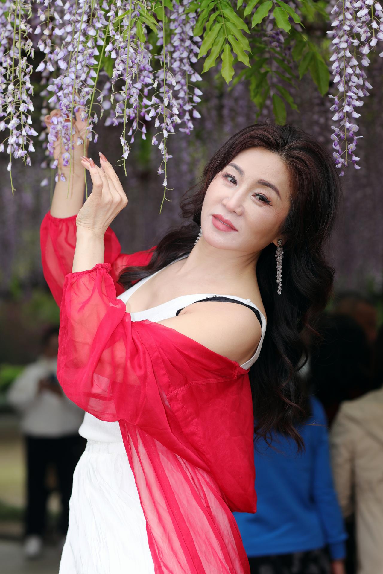 春风拂过紫藤花架,垂落的花穗像紫色的瀑布,在暖阳里漾着温柔的光晕。她一袭白裙衬得肌肤胜雪,外披一件飘逸的红纱,热烈的红与清雅的紫撞出明媚的春日色彩。她笑着伸手轻触花枝,眉眼弯成了月牙,耳间的碎钻耳饰随着动作轻晃,连风都染上了笑意。在这片花影里,她的自在与明媚,比春日的紫藤更让人挪不开眼,每一个瞬间都成了被温柔定格的诗。