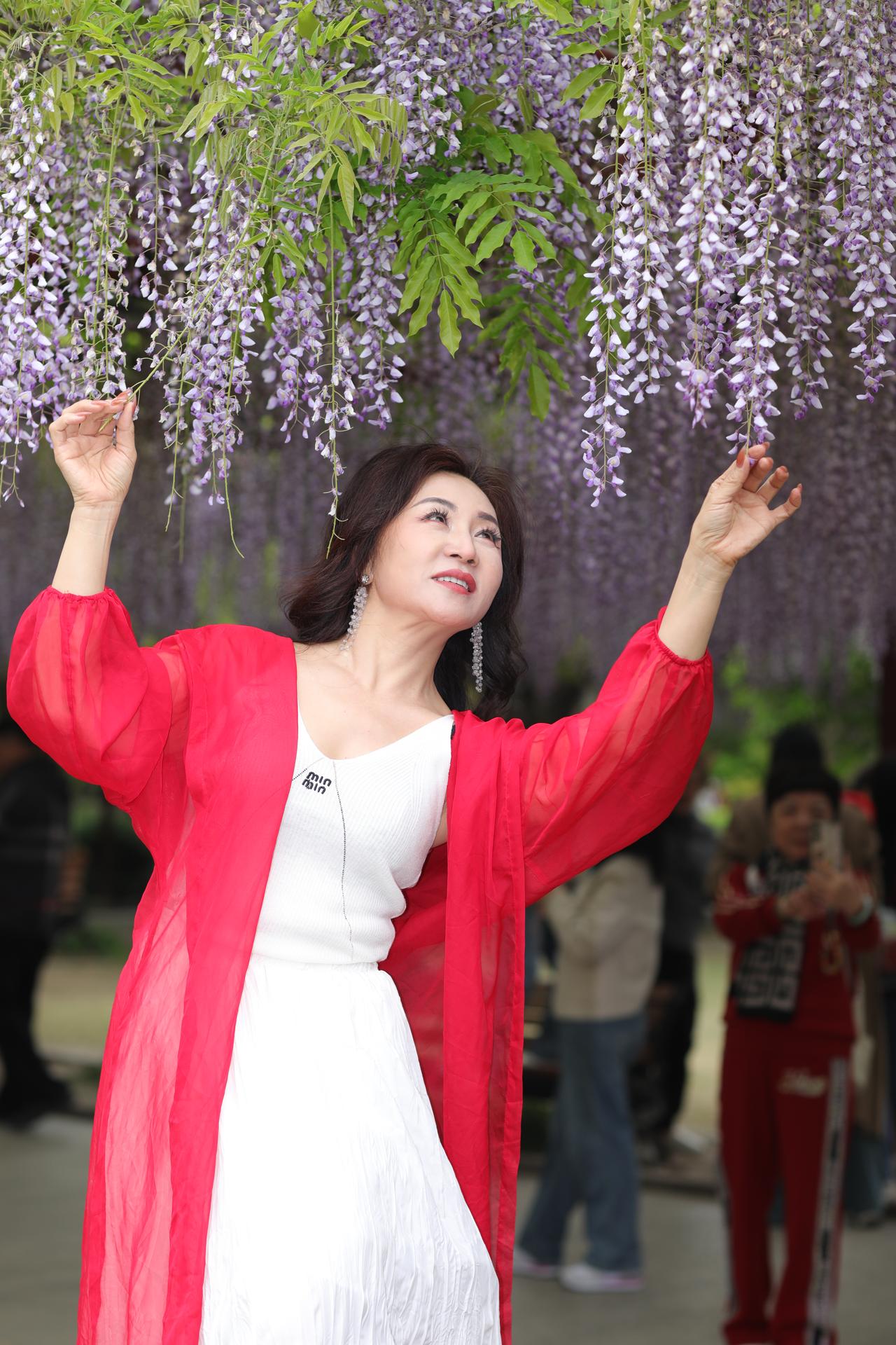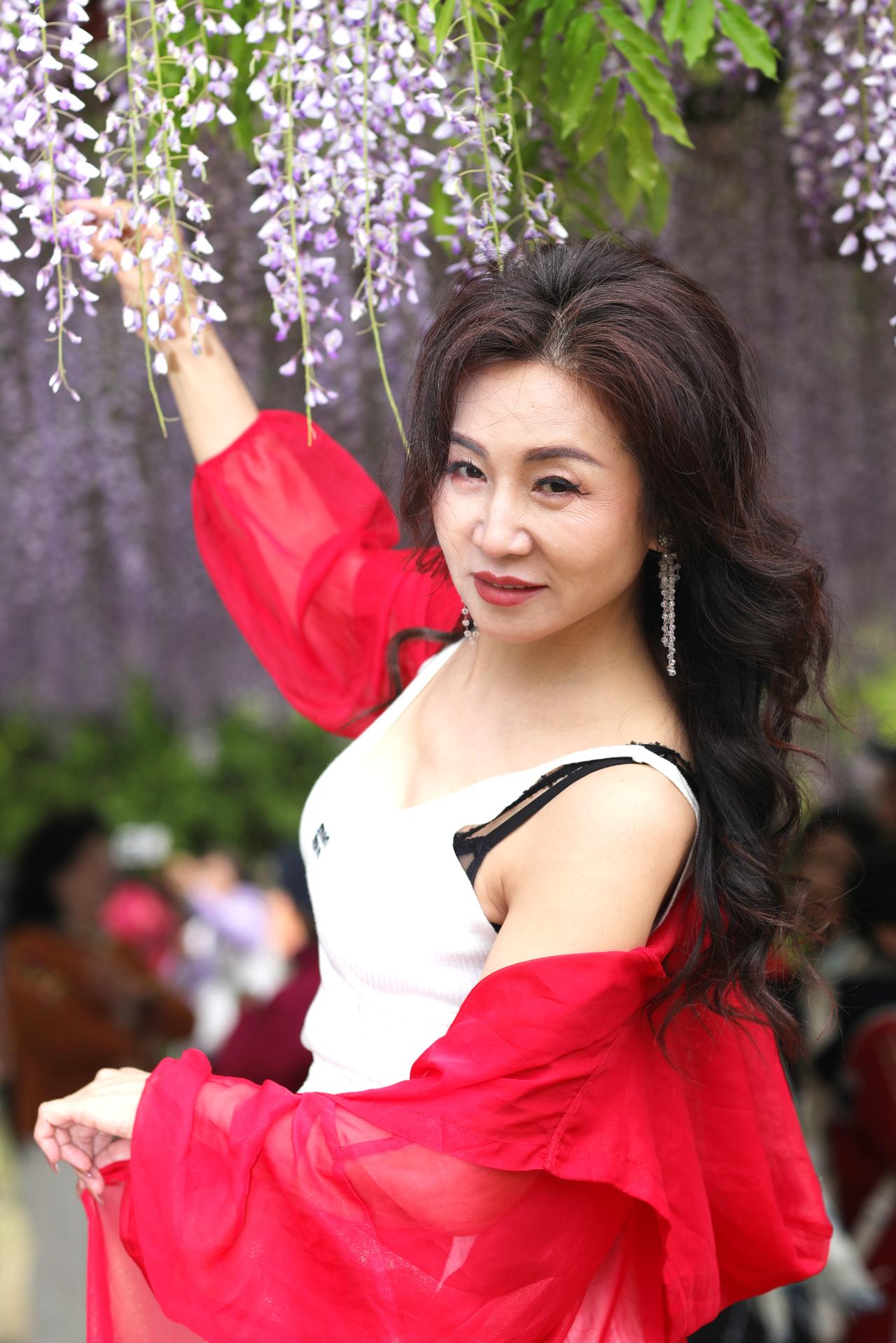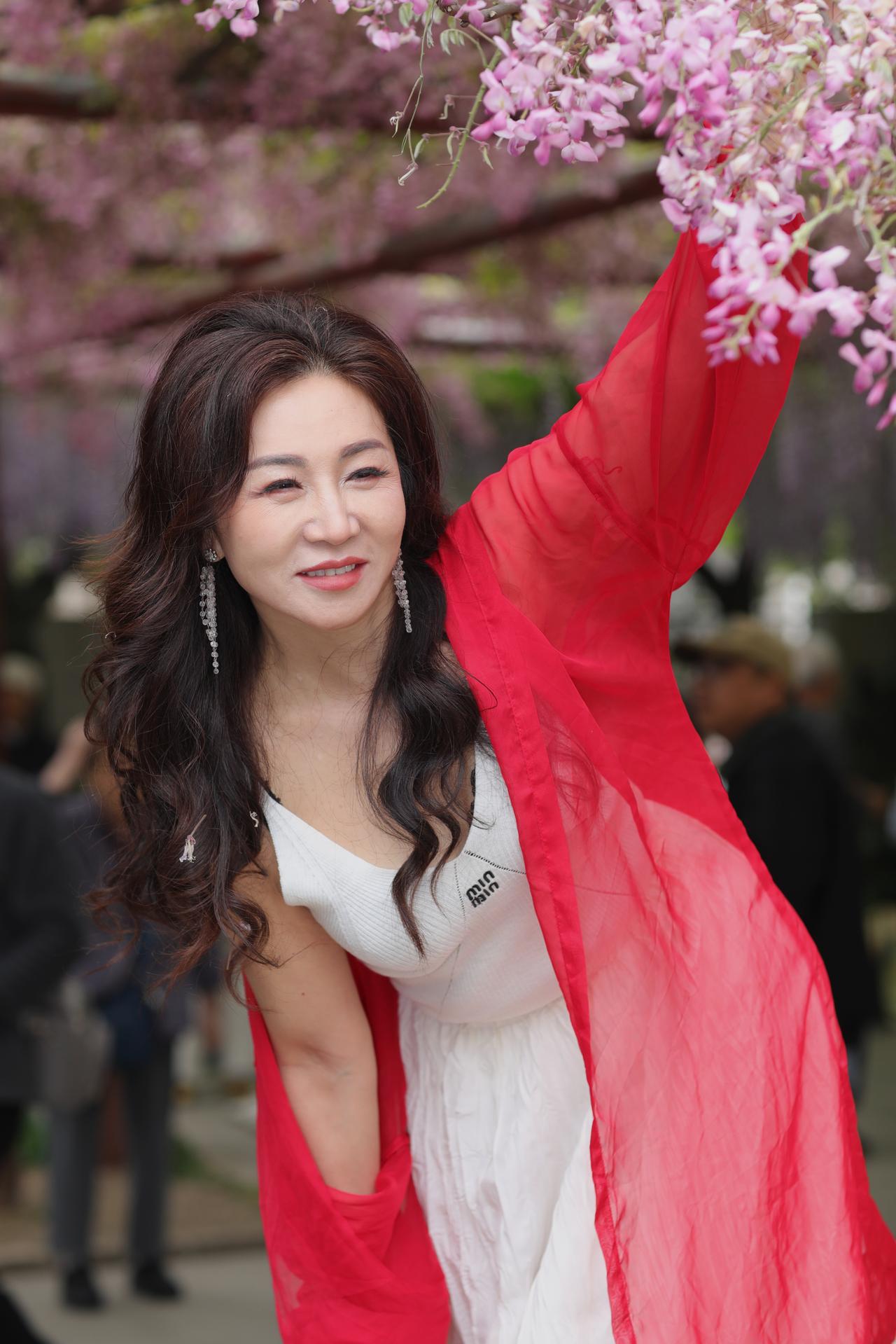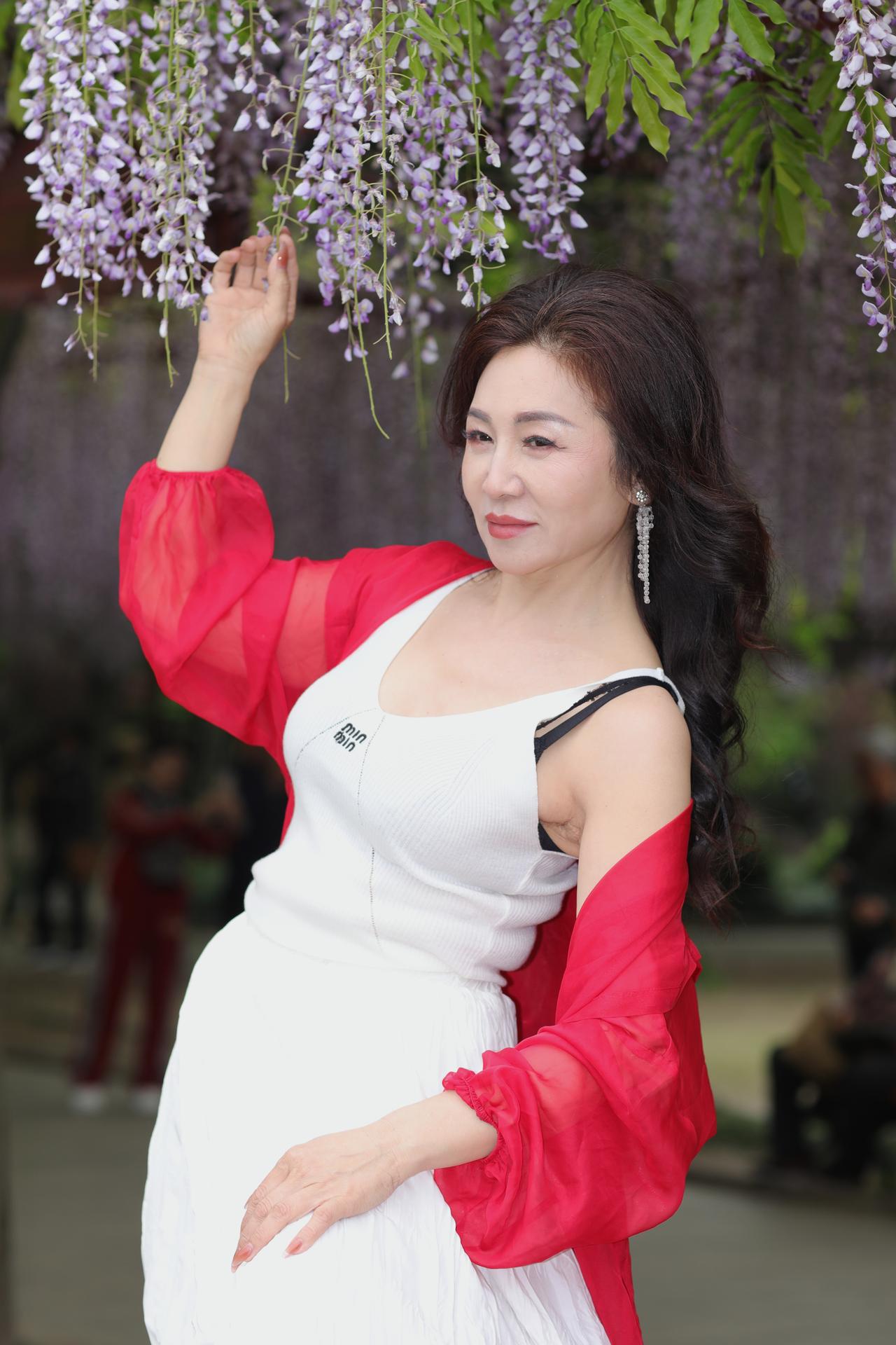 春风拂过紫藤花架,垂落的花穗像紫色的瀑布,在暖阳里漾着温柔的光晕。她一袭白裙衬得肌肤胜雪,外披一件飘逸的红纱,热烈的红与清雅的紫撞出明媚的春日色彩。她笑着伸手轻触花枝,眉眼弯成了月牙,耳间的碎钻耳饰随着动作轻晃,连风都染上了笑意。在这片花影里,她的自在与明媚,比春日的紫藤更让人挪不开眼,每一个瞬间都成了被温柔定格的诗。