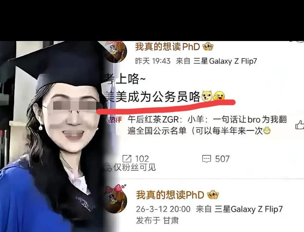 现在大家都看清她了。一个不诚实、还网暴别人的人,还想考公务员?想啥呢?公务员是给国家、给老百姓办事的,品德不过关,想都别想。