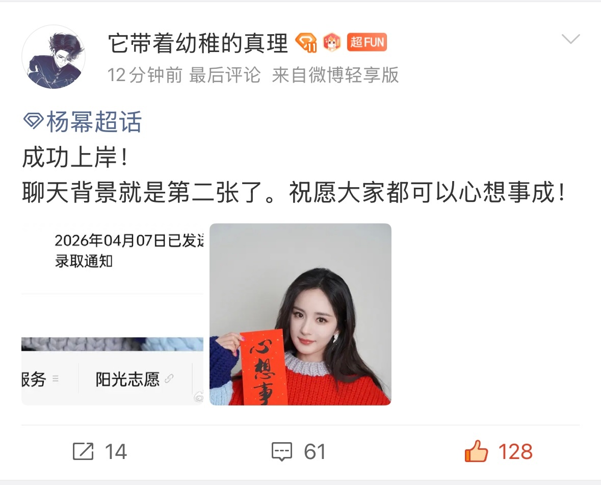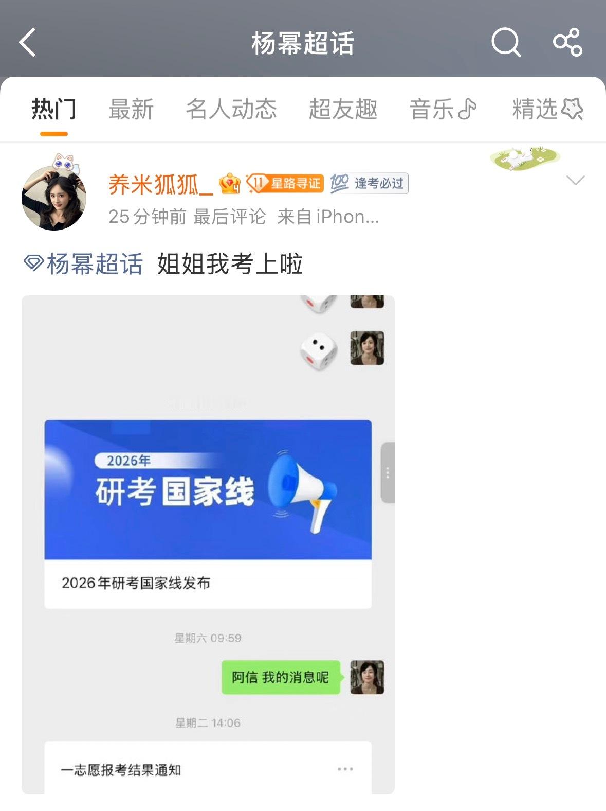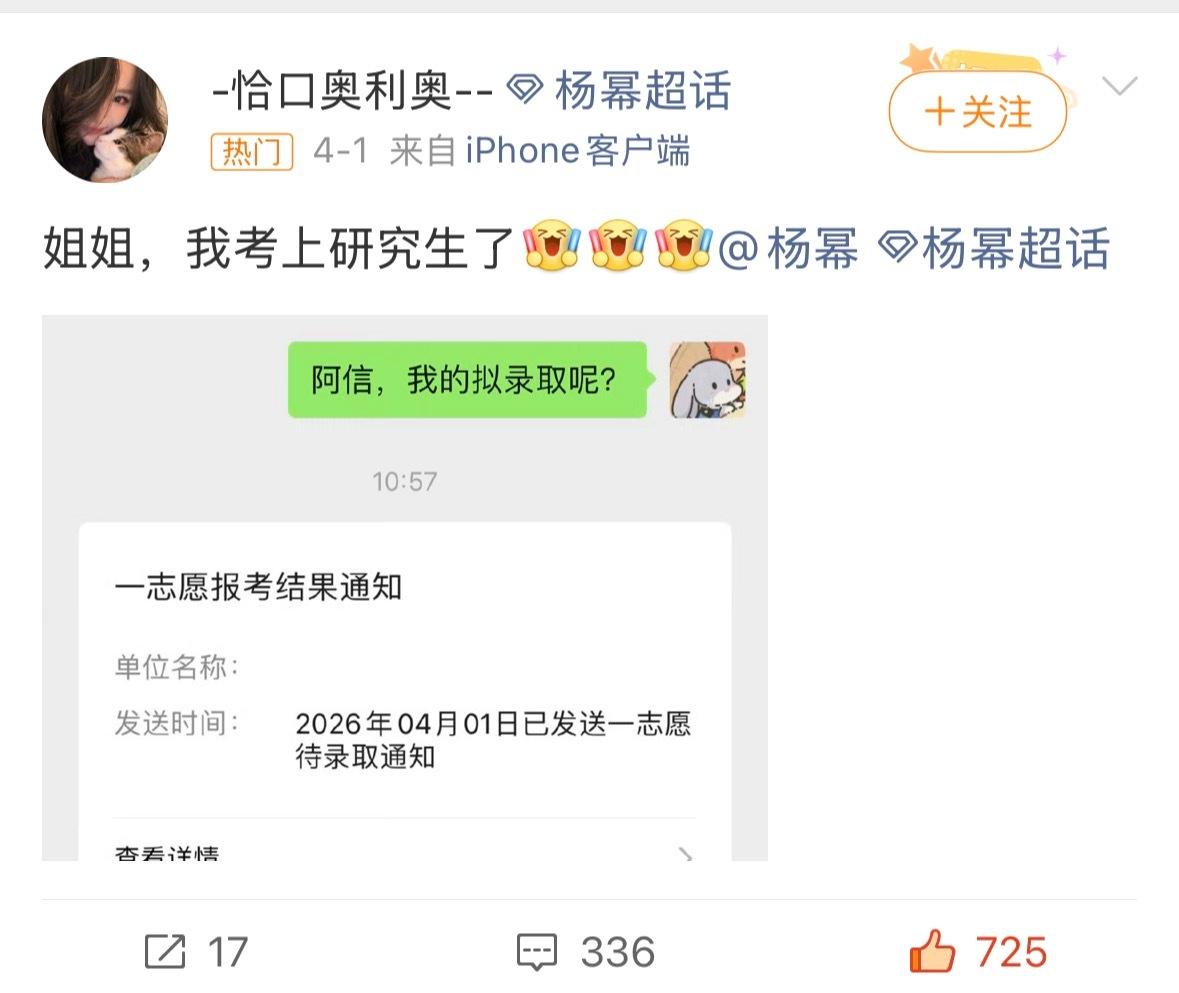 杨幂 最近总在超话看到好多蜜蜂晒出自己考研成功上岸的好消息!喜欢杨幂的同时,杨