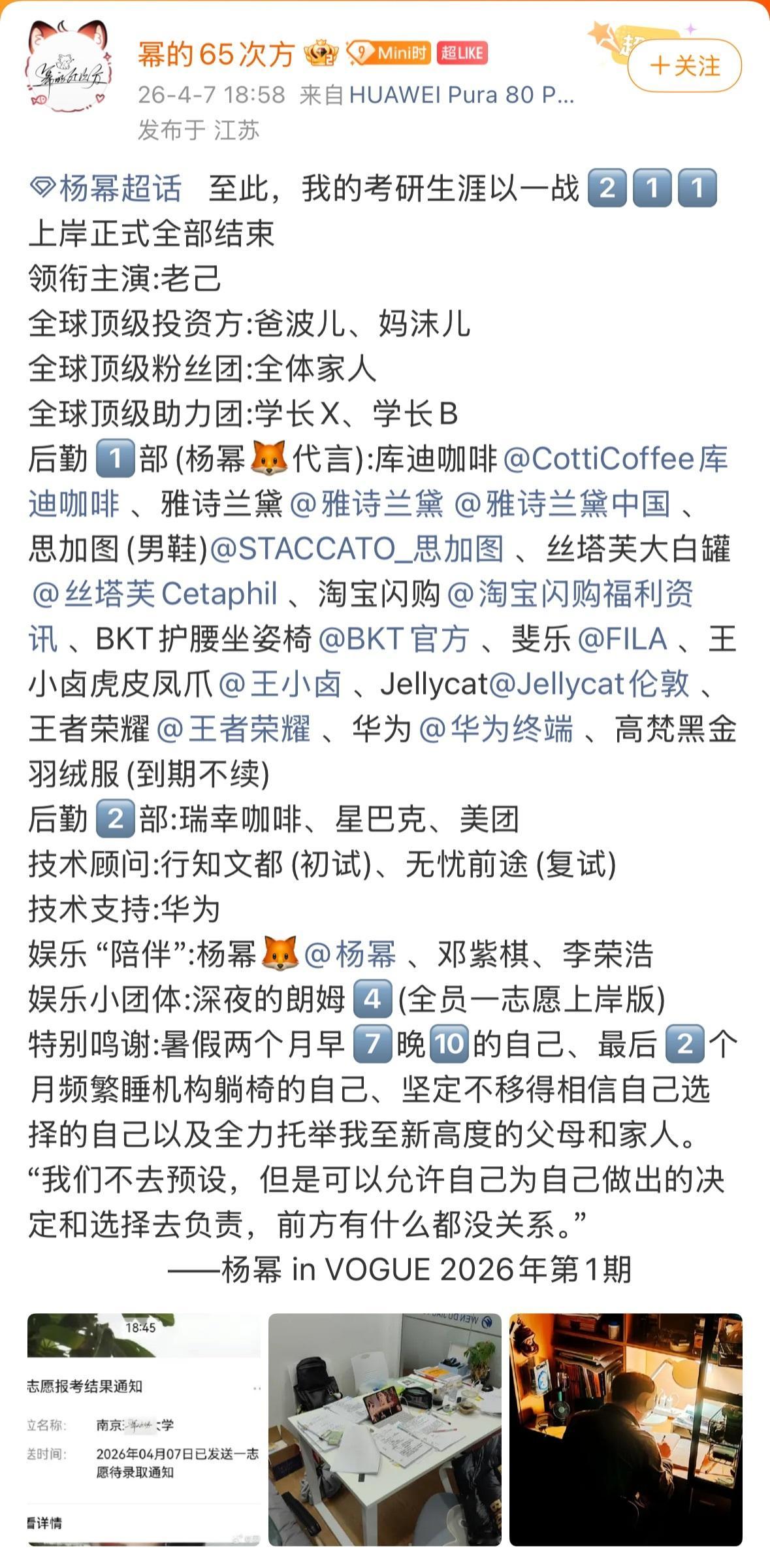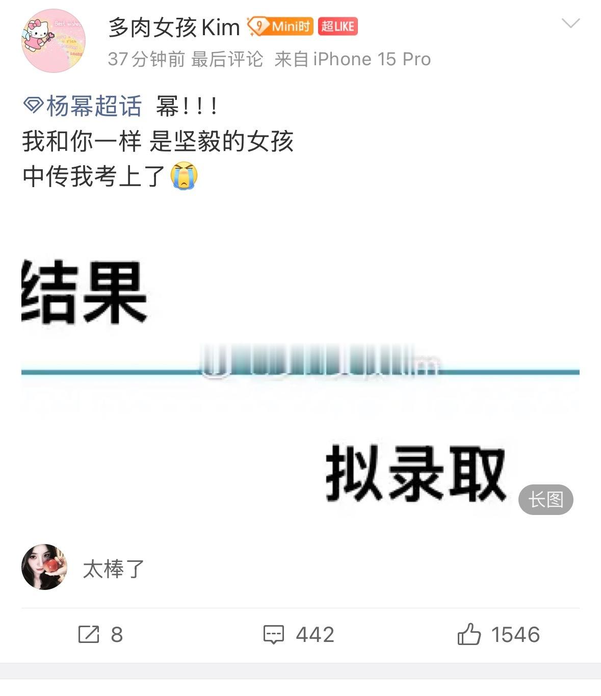 杨幂 最近总在超话看到好多蜜蜂晒出自己考研成功上岸的好消息!喜欢杨幂的同时,杨幂粉丝也在努力变成更优秀的更坚毅的自己,就像幂姐说的“愿每次互相遥望都能看到更好的彼此”