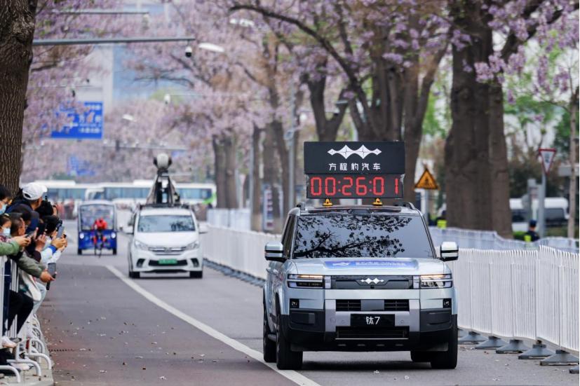 这场21.0975公里的赛事,途经城市道路、坡道、弯道等复杂路况,是机器人从实验室走向真实场景的关键测试。比亚迪旗下方程豹作为官方护航车,凭借全地形通过性、高可靠性,承担领航、保障、救援等任务,全程守护这些“钢铁跑者”。方程豹汽车护航机器人马拉松