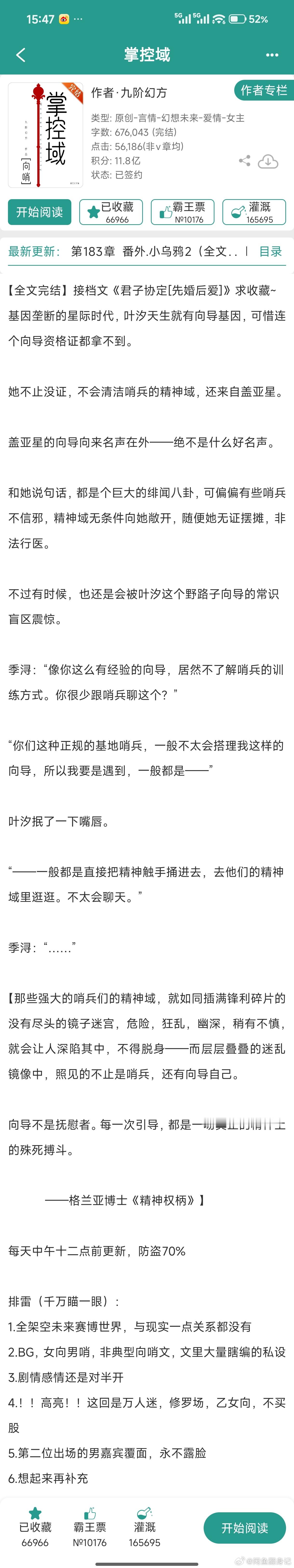 推文热门小说推荐推文 《掌控域》九阶幻方★5 向哨 n..p 算是第一本在毛蛋文学城看的n那个p文,唯一的想法就是恨不相逢在po 文笔很好,九阶幻方出品必属精品,4个男人,女主强大可靠,可以说是最强向导了,主线任务大概就是找到女主家乡星球消失的真相 感情线和剧情都非常的精彩,强推!