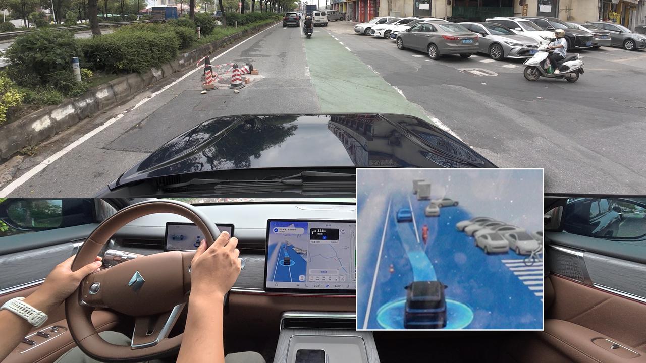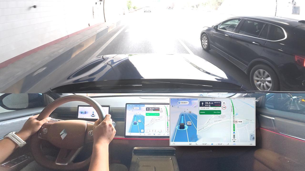 2、博弈胆大心细。华境S搭载的是ADS V4.1.5版本,在复杂场景下,它的信息融合判断既快也准,比如多车道合并双车道,前方还有货车倒车这种场景,它也无惧周边肉搏加塞,跟着车流慢慢通行,这点挺让人意外。变道超车对于安全距离的判断也很精准,旁边车道有慢车,前方有占道车,它会选择先超慢车再绕行。