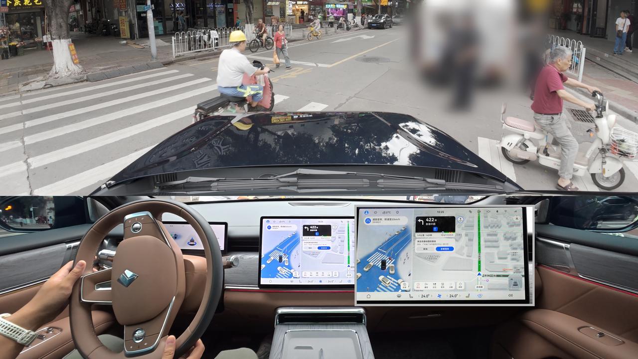 3、慢速礼让。面对城市各种横穿的非机动车、行人,华境S不是完全停下让行,而是拖着1-2km/h速度挪动,中途会带一点方向,在城区窄路行车这点显得足够人性化。
