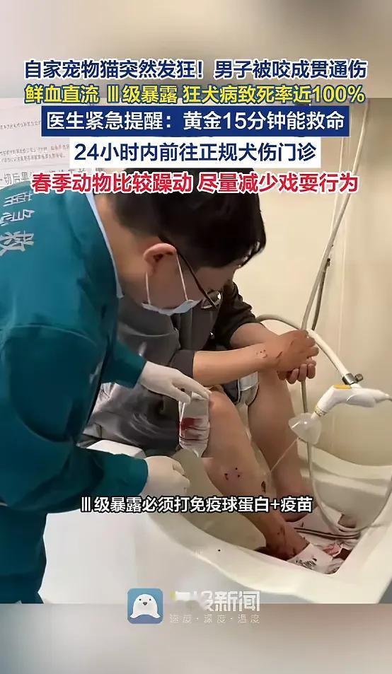男子养了只猫有5年。一日,猫突然发狂,咬了男子,男子被确诊为狂犬病三级暴露,医院给他清创处理,打了狂犬疫苗。