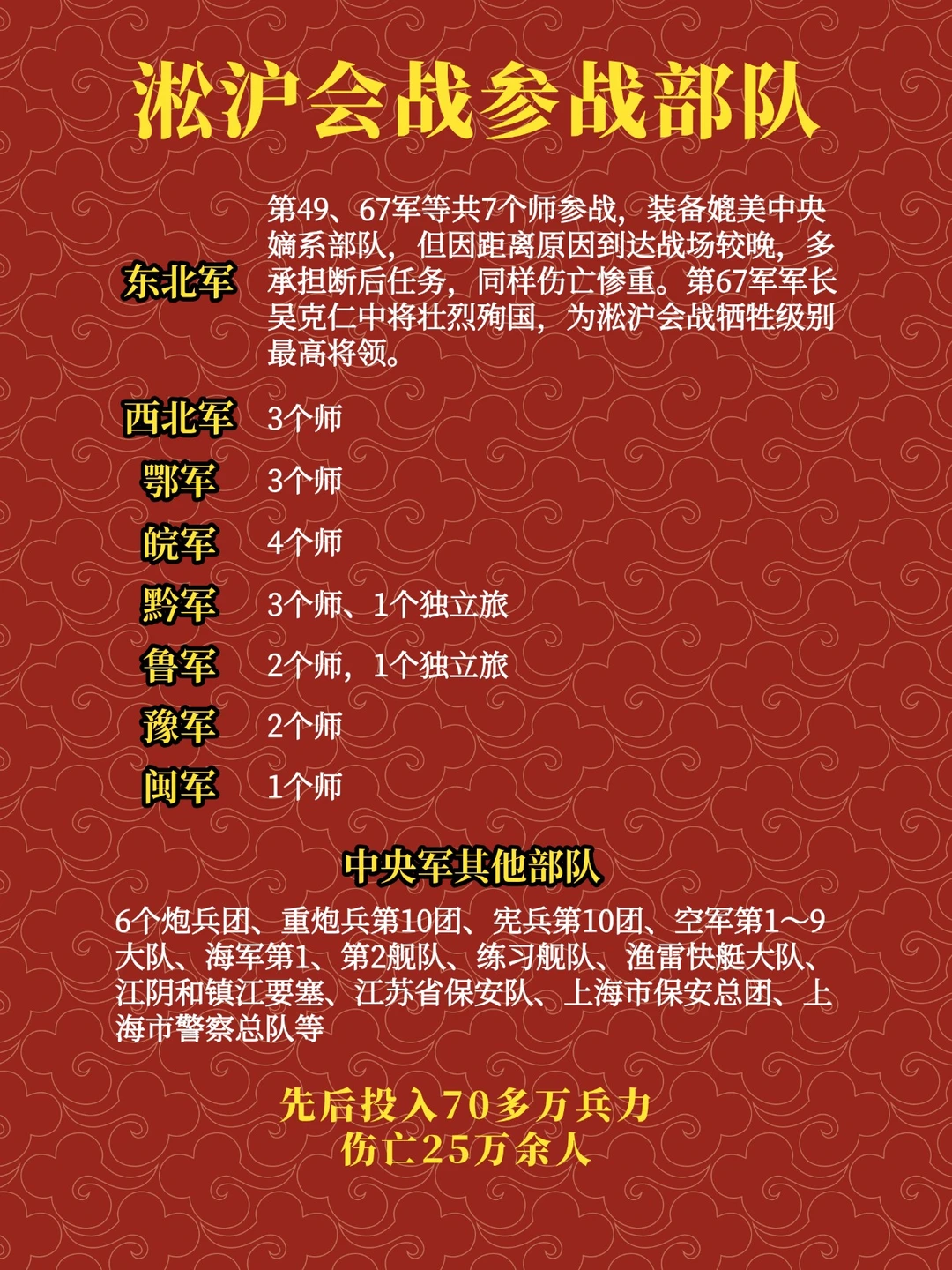 淞沪会战是全面抗战中规模最大、战斗最惨烈的战役。中国军队先后投入约70万人,伤亡25万余;日军投入约30万人,伤亡4万余。此役粉碎了日军“三月亡华”计划,迫使其侵华主力由华北转向华东,为中国赢得了战略主动与工矿内迁时间。中国军民浴血奋战三个月,以巨大牺牲彰显了抵抗侵略、保卫民族生存的不屈意志,也赢得了国际社会的同情与尊敬。