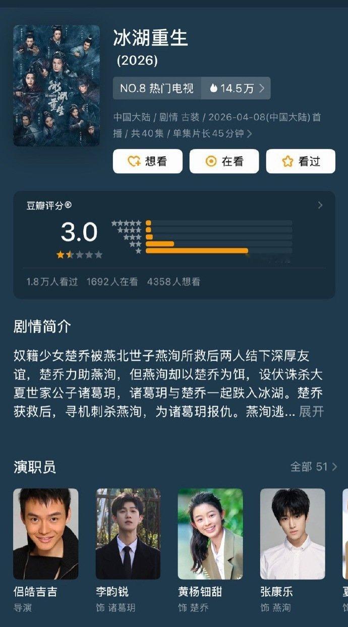 冰湖重生真是令人震撼:双平台全程0广 / 豆瓣评分3.0鹅热度最高21315,