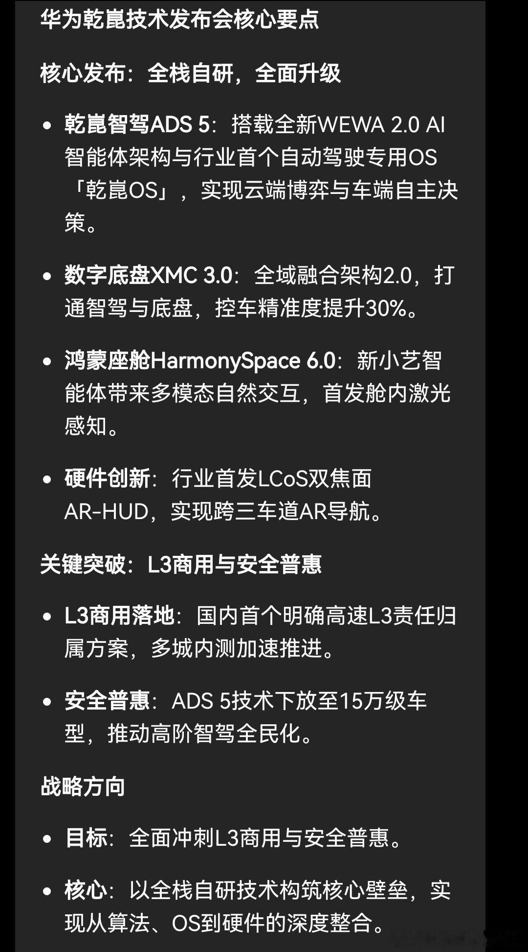 昨天华为乾崑的技术发布会没来得及看,用AI直接总结了一下,还是挺方便的。这里应该是再次强化了未来更高级别辅助驾驶或者自动驾驶的能力和安全