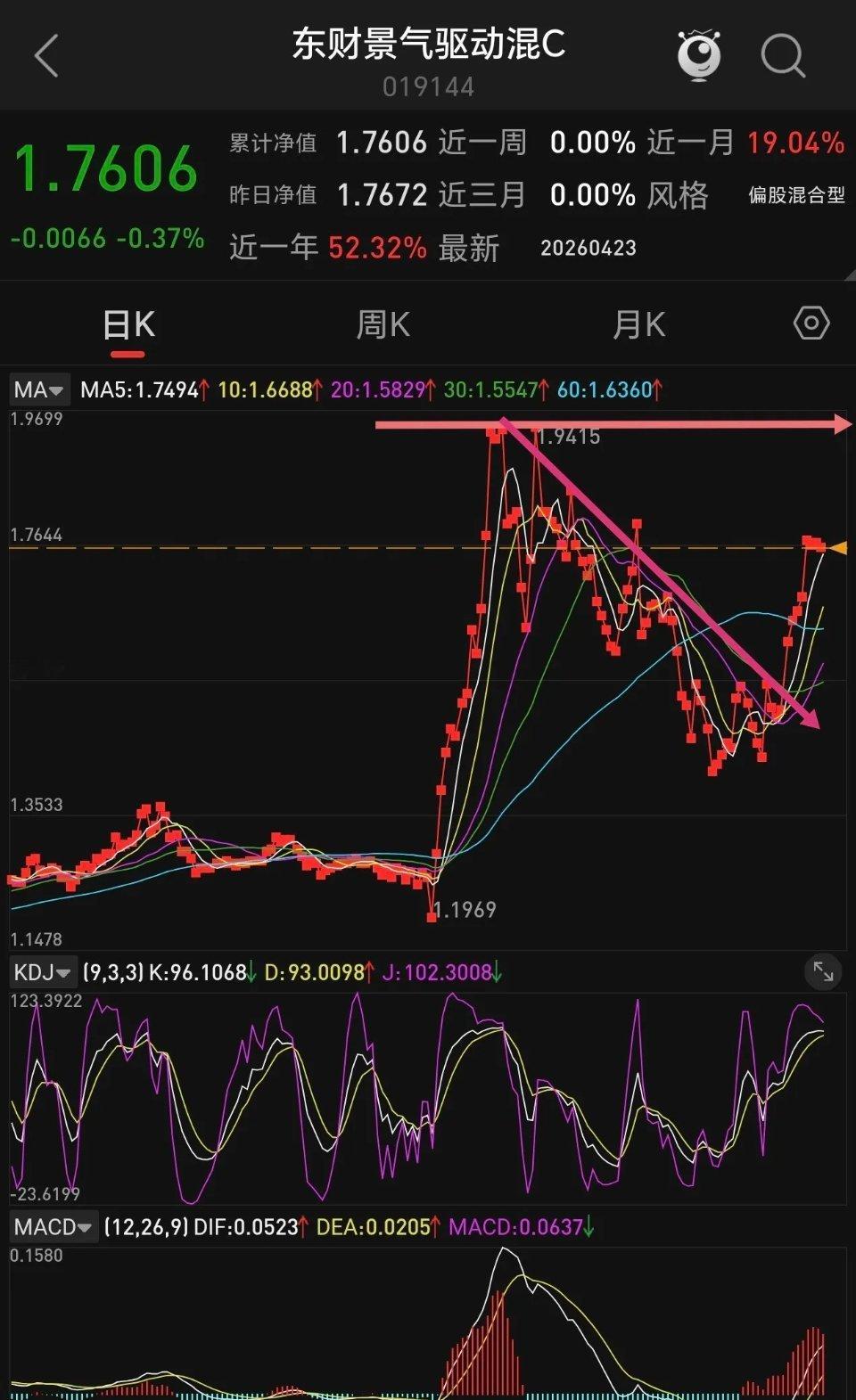 今天给大家深挖一只商业航天纯赛道基金——东财景气驱动混合,从持仓布局到业绩表现,再到技术面趋势,每一点都透着“专注主线、趋势向上”的信号,干货满满!先看核心定位:这只基金是商业航天赛道的忠实押注者,从2025年第四季度开始,投资思路彻底聚焦商业航天,前十大重仓股全部换成赛道核心标的,中国卫通、中国卫星、航天工程、臻镭科技等清一色商业航天龙头,持仓集中度直接拉满 。到了2026年一季度,基金丝毫没有换赛道的意思,依旧重仓坚守商业航天,对这条赛道的中长期信心十足,堪称商业航天的“铁杆粉丝”基金。再看业绩表现,短期爆发力极强,抗跌性也很能打:- 近一周大涨5.86%,近一月更是狂涨24%,在震荡市里走出独立强势行情;- 近三个月虽小幅回调9%,但这是赛道短期波动下的正常休整,对比同类产品,业绩直接超过永赢高端装备,赛道内竞争力突出;- 本周四市场调整时,它仅小幅下跌0.43%,跌幅远小于多数赛道基金,抗跌属性拉满,资金认可度扎实。最关键的是技术面趋势,周线级别反弹明确,上涨行情还没走完!从周线走势看,三大信号共振看多:1. 趋势突破:已有效突破前期下降趋势线,彻底摆脱调整通道,趋势反转信号明确;2. 指标金叉:KDJ金叉后持续上行,多头动能不断增强;MACD即将金叉,一旦形成,将进一步确认周线级上涨趋势;3. 均线多头:5、10、20、30、60周线全部向上发散,短期、中期、长期均线形成多头排列,支撑层层向上,上涨基础非常牢固。简单说,目前的日线回调,只是周线上涨过程中的小休整,完全不影响周线级别的反弹大趋势,当前依旧处于趋势向上的窗口期,持仓待涨逻辑通顺。总结下来,东财景气驱动混合是一只商业航天纯度高、业绩弹性足、技术面趋势明确的赛道基金:持仓死磕商业航天,短期业绩亮眼、抗跌性强,周线级别反弹趋势确立,日线回调就是趋势中的良性休整。对于看好商业航天中长期行情、想布局赛道基金的朋友来说,这只基金值得重点关注,周线反弹未完,可继续持仓待涨。风险提示:以上仅为基金基本面与技术面分析,不构成任何投资建议,基金有风险,投资需谨慎。